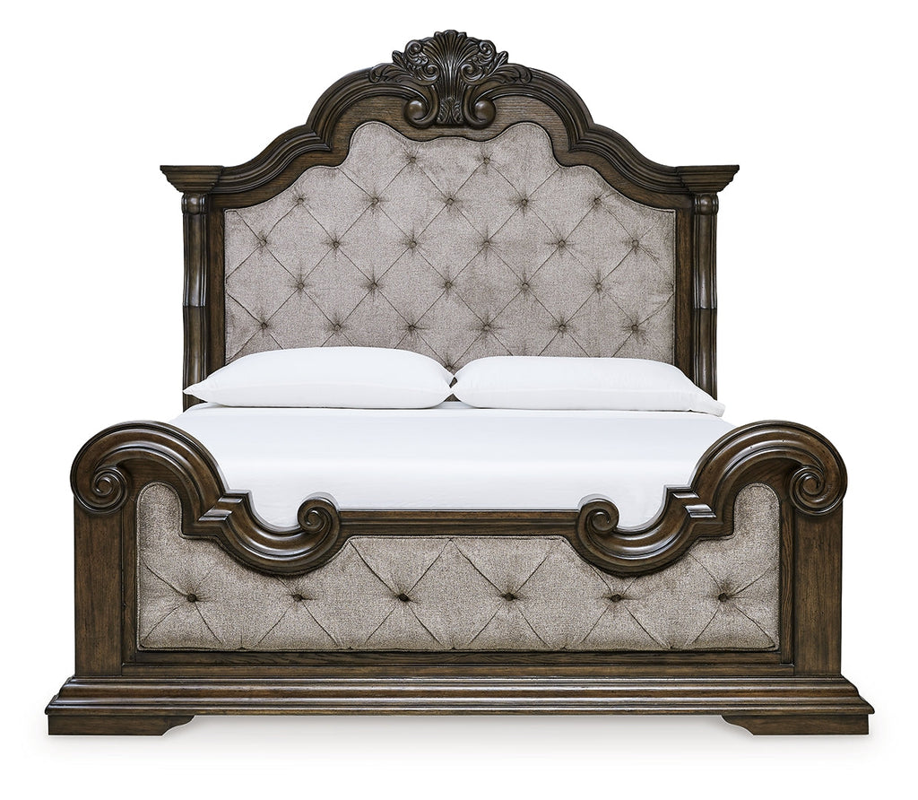 From its ornamental appliques to its large scale, this California king upholstered bed makes a bold statement. Showcasing sculptural ornate details and button tufting, this opulent bed wows with stunning style. The look is timeless. The feel? Right at home.