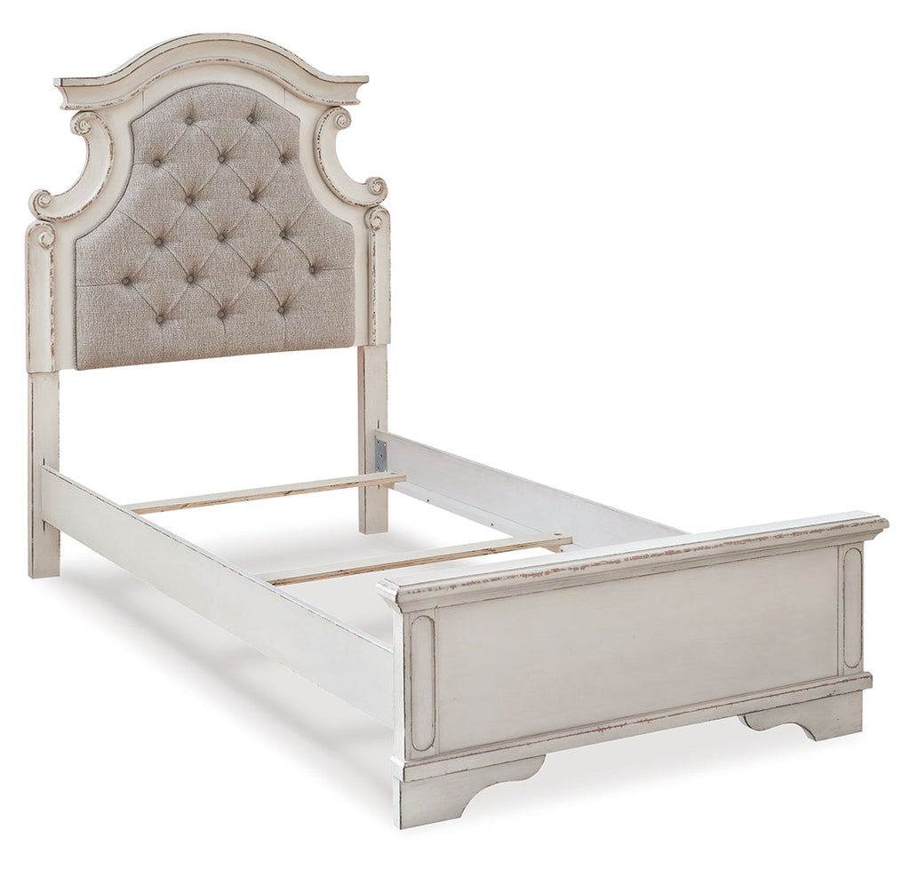 - California king upholstered bed (headboard, footboard and panel rails with roll slats)