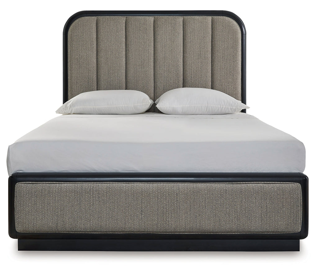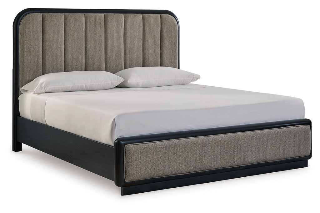 Inspired by art deco design, this softly shaped California king upholstered panel bed makes a lasting impression in a simply stunning way. Its magnificent curved silhouette is enhanced by a rich layered black finish on the textured wood grain surface. The channeled vertical headboard and footboard, wrapped in herringbone textured upholstery, merge form and function. This is the statement piece you’ve been dreaming of to elevate your contemporary inner sanctum.