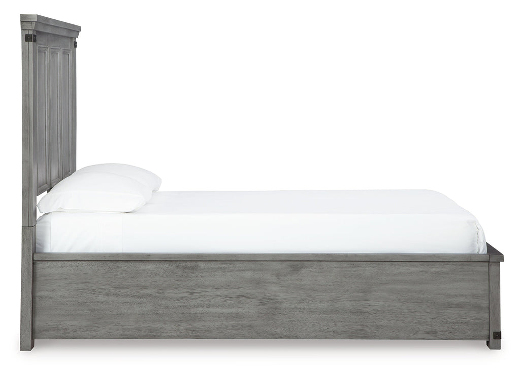 - Includes California king panel headboard, storage footboard and rails with roll slats