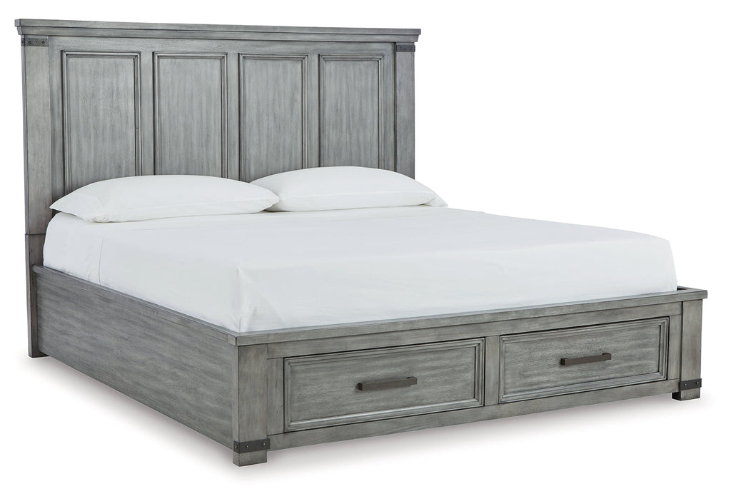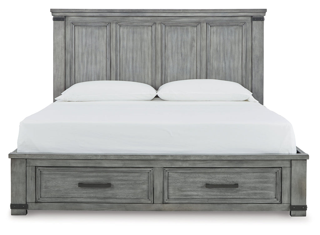 With its light weathered gray coloration, this storage bed conveys trend-right urban farmhouse style. Thick-profiled top moulding on the tall, mansion-scale headboard lends a fresh take on a timeless design. The footboard features two storage drawers with profiled frames and dovetail construction. Bar pulls and metal straps in a dark aged bronze tone add to the rustic-yet-refined aesthetic.