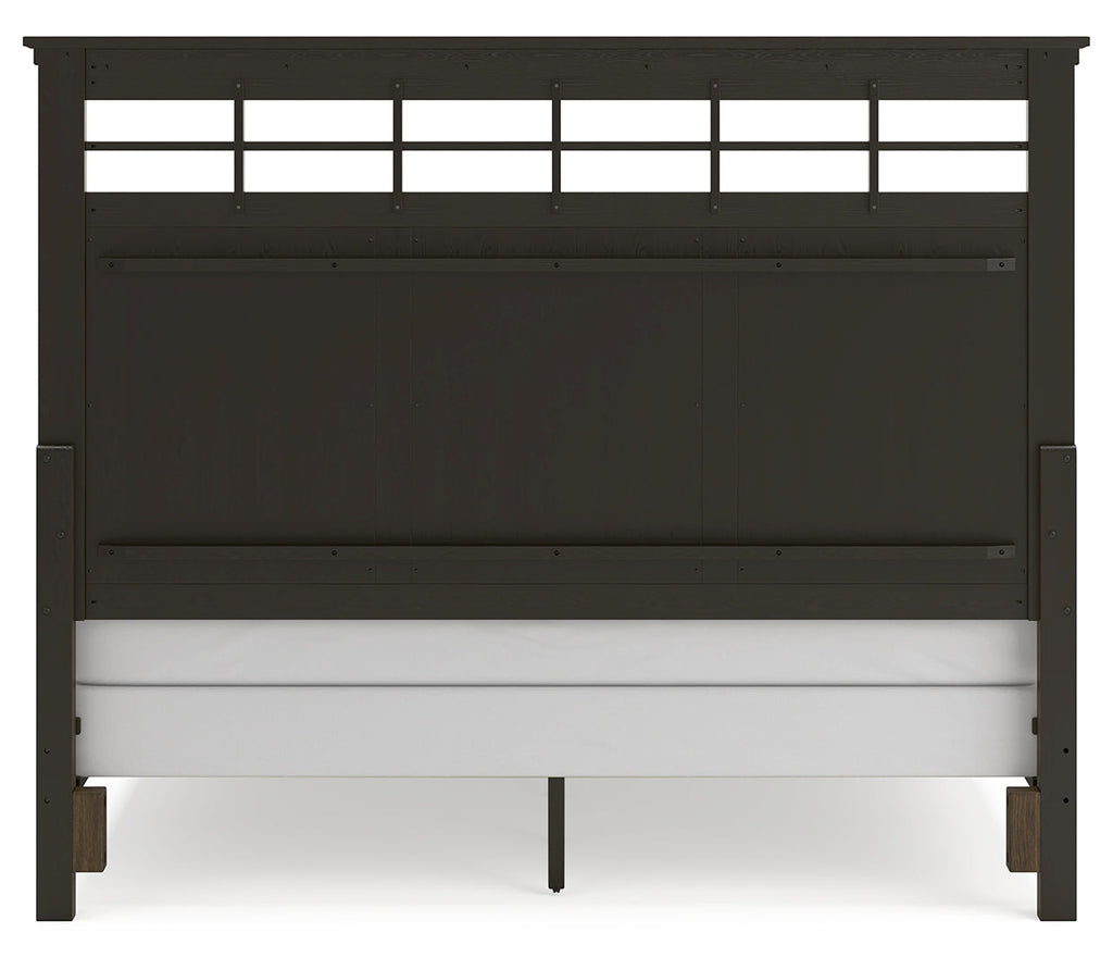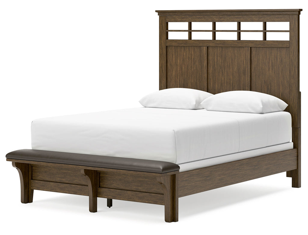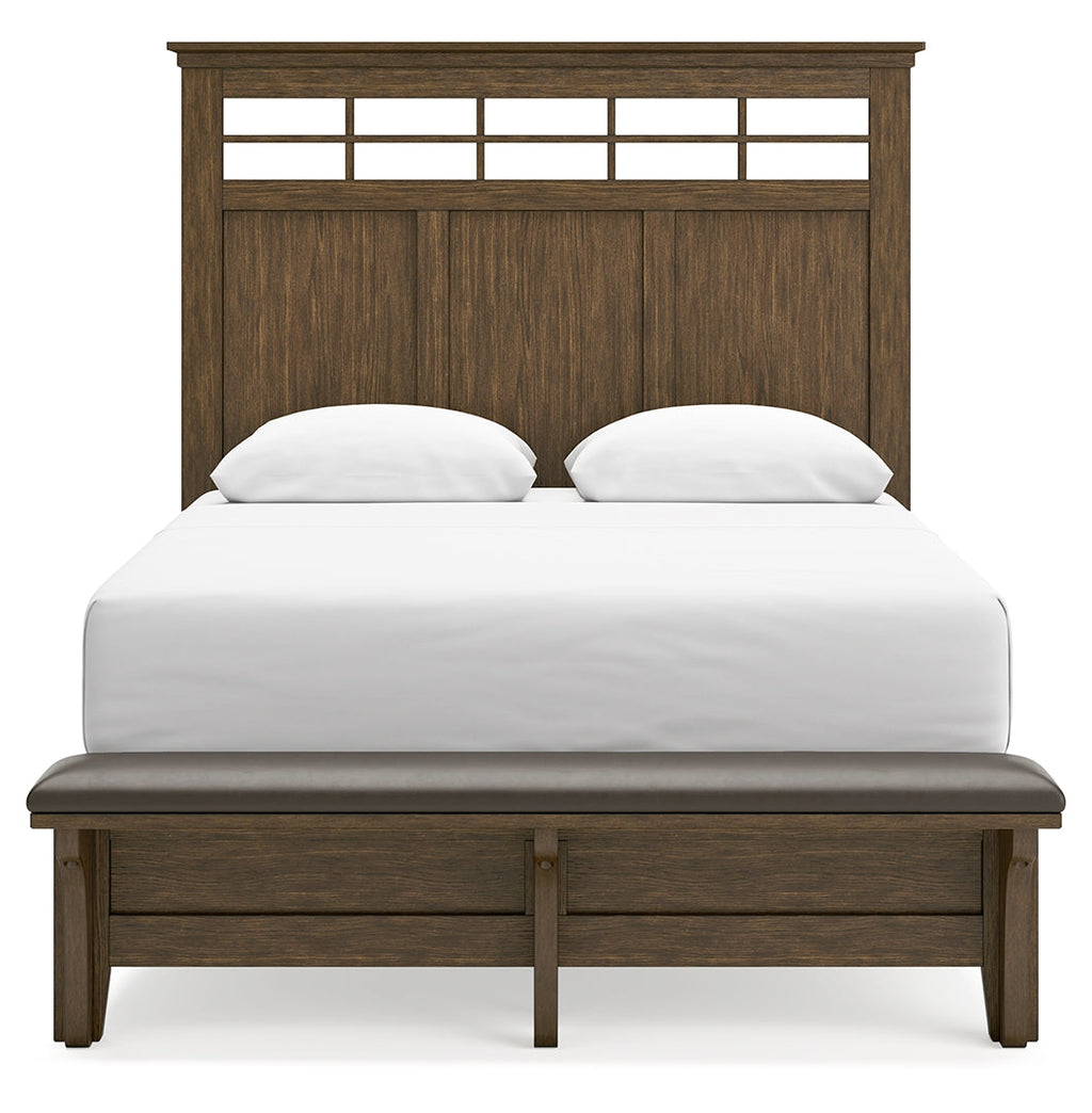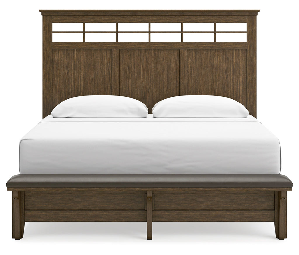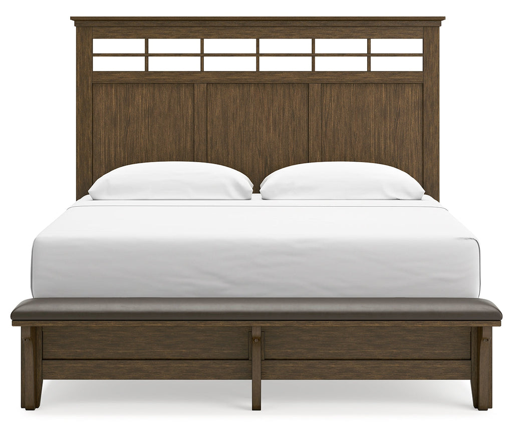 This California king panel bed is well-suited to everyday living with its expertly balanced approach to style and function. Take the stress out of decorating—a classic medium brown finish easily pairs with existing furniture pieces. Its timeless design stays in style as you update your space, while open detailing at the top of the headboard is a trendy touch. And its cushioned footboard bench provides seating for morning get-ready routines or late night chats. All that's left for you to do is to effortlessly enjoy the day-to-day comforts of home.