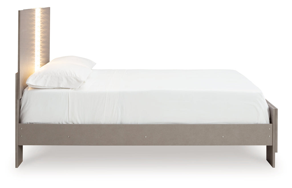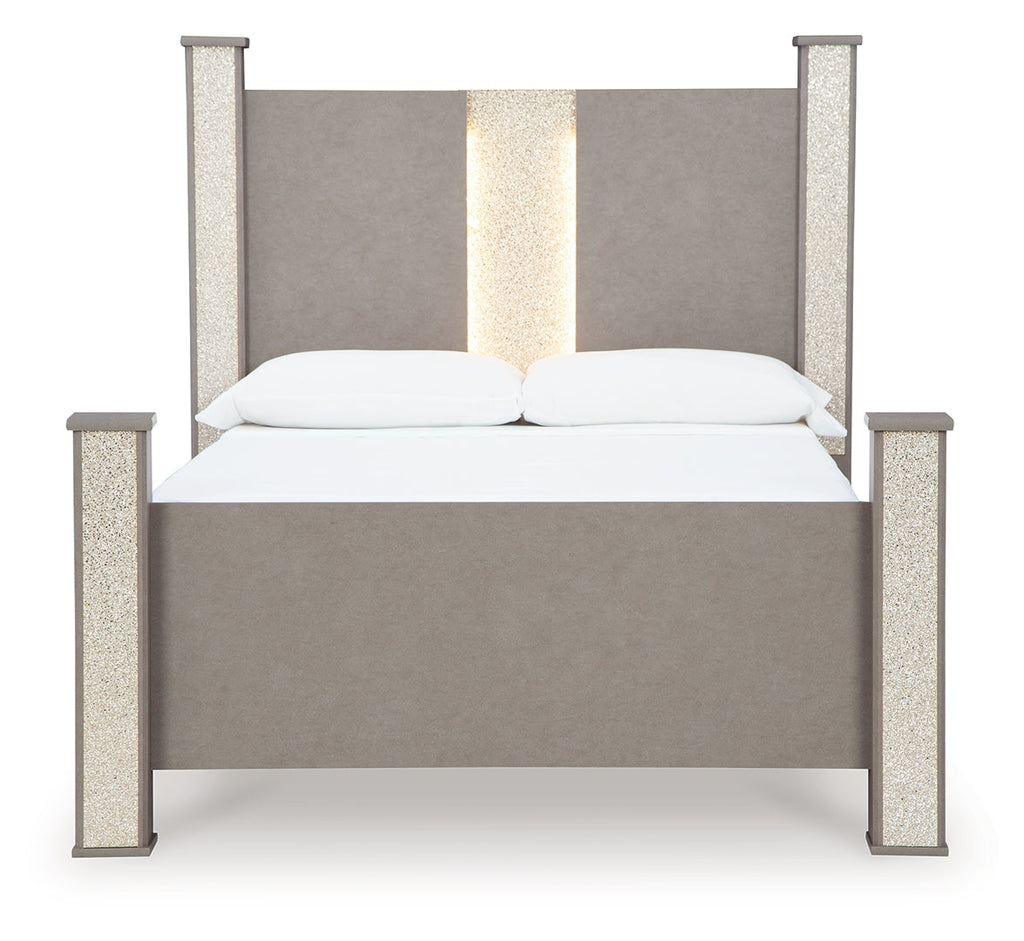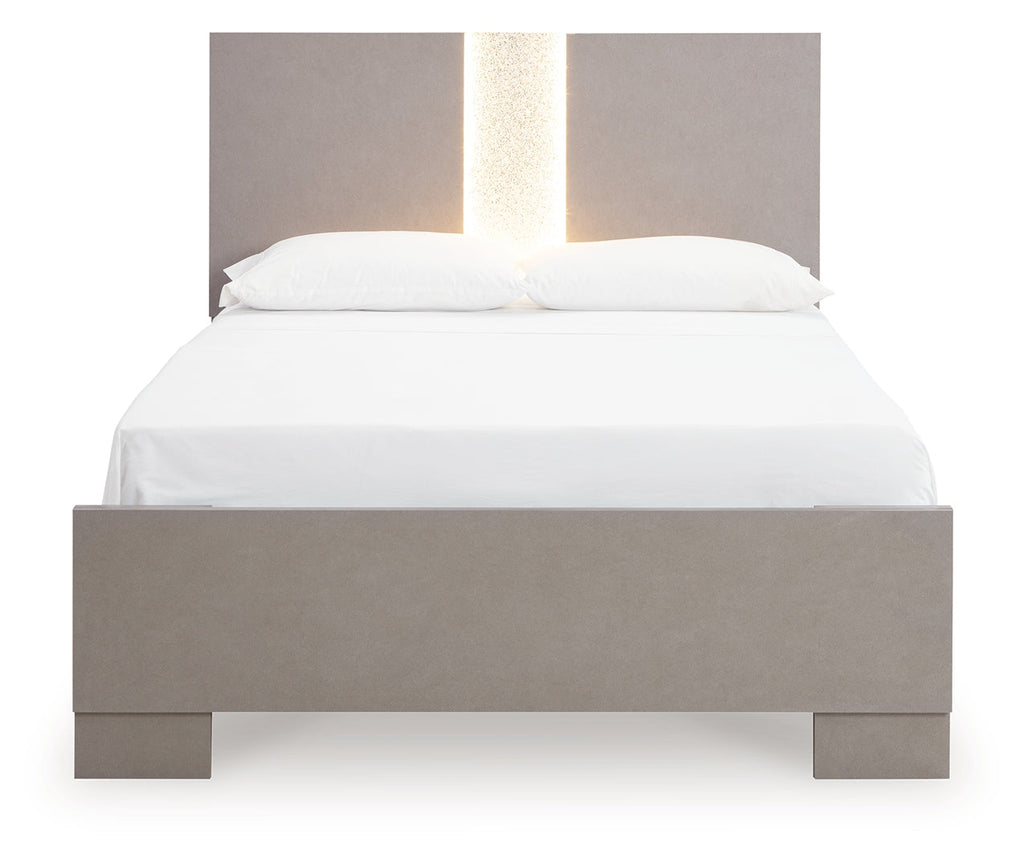 Love sleek and bold contemporary style? Drink in the beauty of this full panel bed. The piece's eye-catching details include a leather grain look, glam glitter accents and remote-controlled LED lighting. Combined with the streamlined aesthetic, it's a simply stunning way to achieve the bedroom of your dreams.
