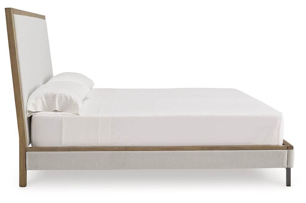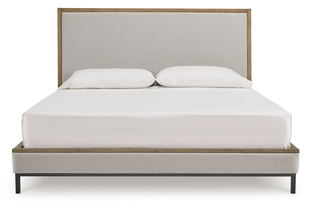 Sleek in its simplicity, this king upholstered bed takes a relaxed approach to refinement. The mixed-material design brings a trendy urban-chic feel to bedtime, while its functional features add convenience. A cushioned lay-back headboard makes reading or watching TV in bed all the more comfortable. And with sturdy roll slats included, your mattress is supported without the additional expense of a foundation or box spring.