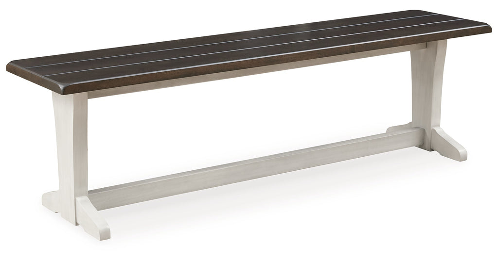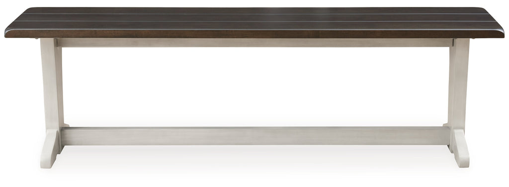 Make a farmhouse-inspired statement with this dining bench. It's beautifully crafted with a clean, classic two-tone finish and a thick planked effect. Making room for the whole family, this bench sports a casually comfortable vibe.