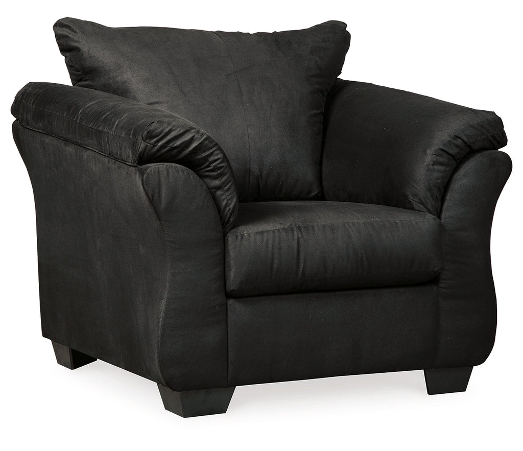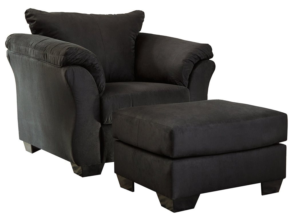 Talk about fine lines and great curves—that’s the beauty of this chair and ottoman. Made to suit your appreciation for clean, contemporary style, this fashion statement is complete with a striking flared frame, comfy pillow top armrests, tapered feet on the ottoman and an ultra-soft upholstery that holds up to everyday living.