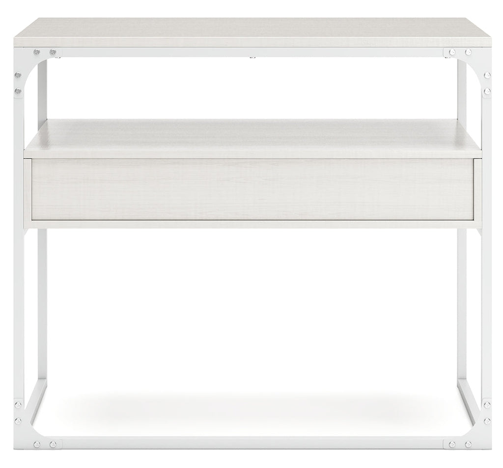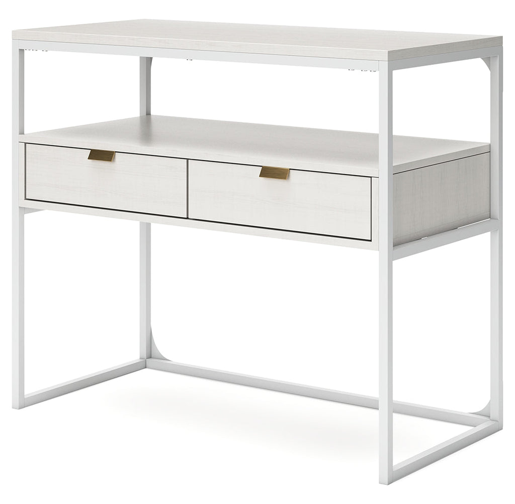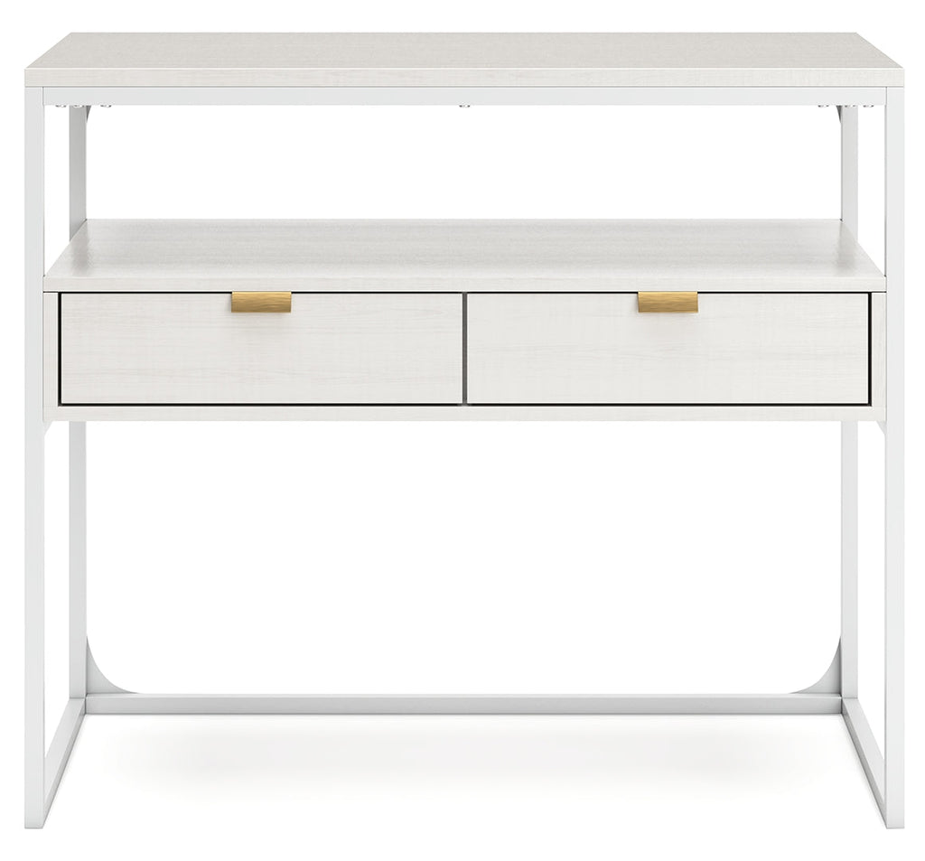 Bring your vision of a modern home workspace to life with this sleekly designed credenza. Its linear construction and white finish keep things minimal, while goldtone hardware on the two drawers adds subtle refinement. An open shelf rounds out the versatile, striking design.
