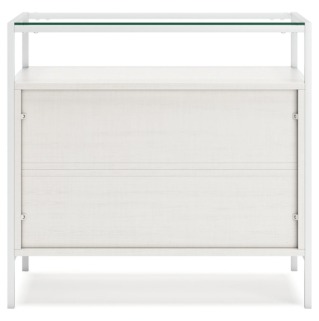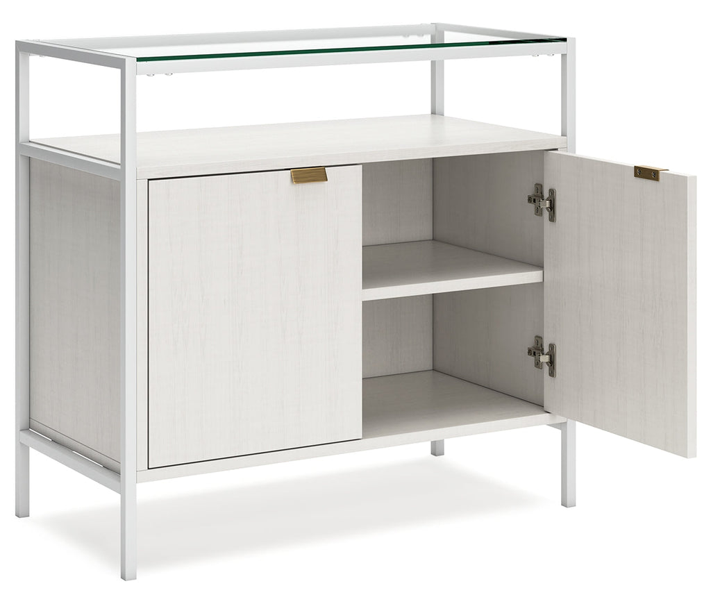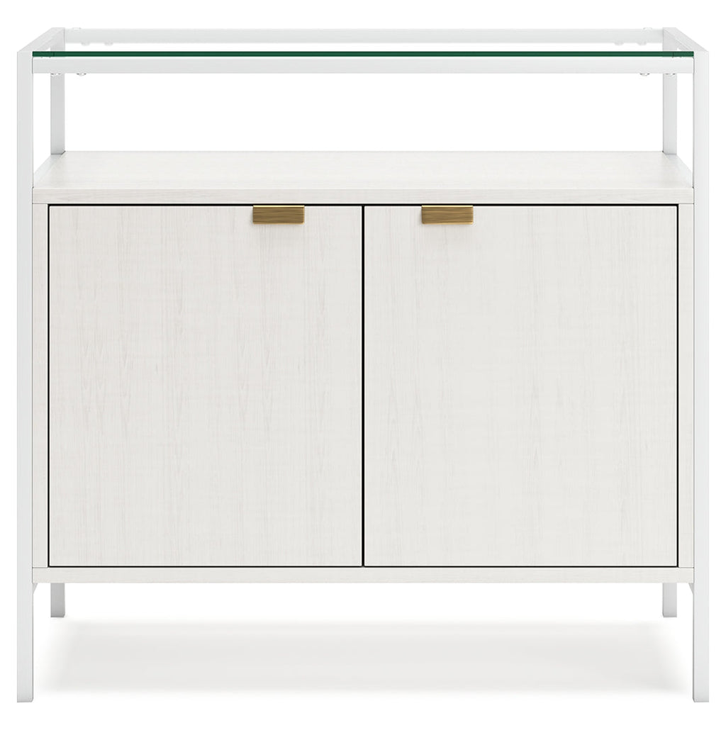 Bring your vision of a modern home workspace to life with this sleekly designed small bookcase. Its linear construction and white finish keep things minimal, while goldtone hardware on the double-door cabinet adds subtle refinement. An open shelf and glass top round out the versatile, striking bookcase.