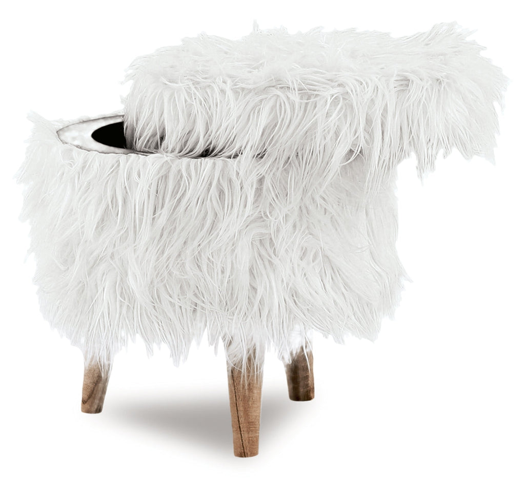 Put a charming modern spin on your ensemble with this chic storage ottoman. This fun loving boho-chic ottoman features a round-shaped faux fur fabric seat in white supported by four tapered natural wooden legs. The top can be removed to reveal a spacious compartment perfect for stowing away various household knick-knacks. Apart from seating and storage options, this stool also serves as a comfortable foot and leg rest and a stunning living room accent accessory.