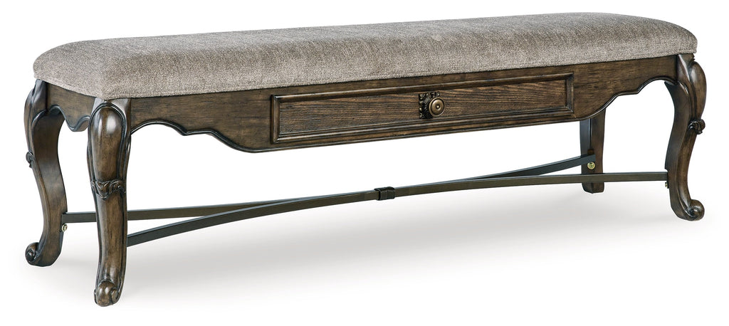From its ornamental appliques to its large scale, this dining bench makes a bold statement. With ornately shaped legs, a plush cushioned seat and a storage drawer, the opulent bench wows with stunning style. The look is timeless. The feel? Right at home.