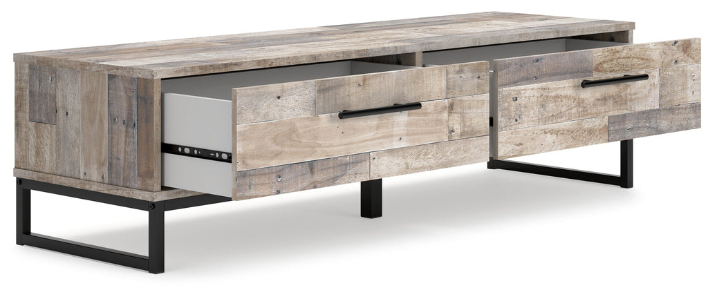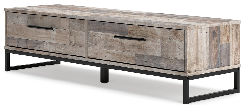 Part beach chic, part urban hip, this storage bench provides stylish storage at a comfortably cool price. The butcher block whitewash finish over replicated pine grain lends a richly relaxed aesthetic that suits your sensibility. Two smooth-gliding drawers neatly tuck away clutter. Dark pewter-tone drawer pulls and metal legs add a high-design element.