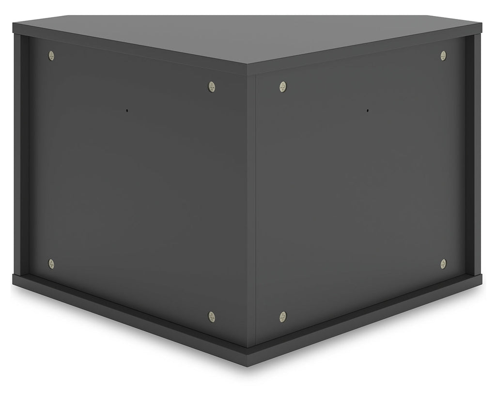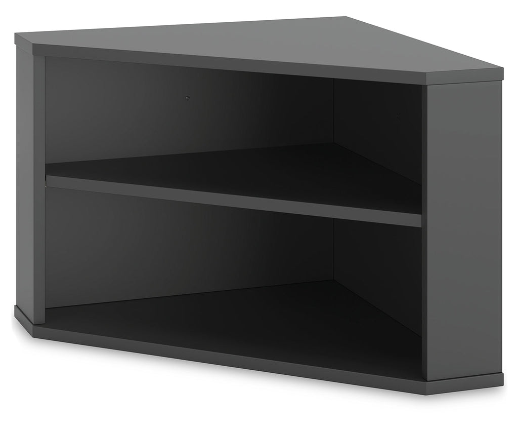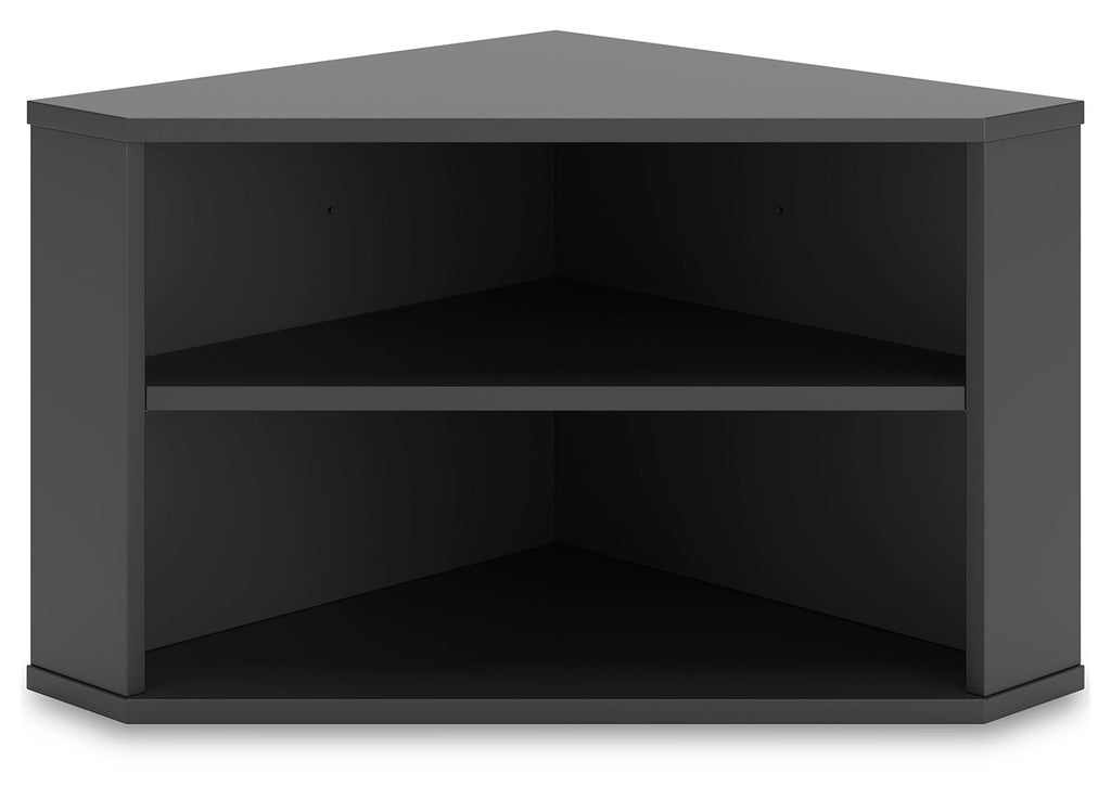 Stunningly streamlined. This home office corner bookcase provides a polished, practical solution for small spaces. Its sleek black finish pairs with a variety of styles, while the two open shelves offer convenient space to store and display. Simply slip this clean-lined piece into the corner of your choosing to help craft a versatile workstation.