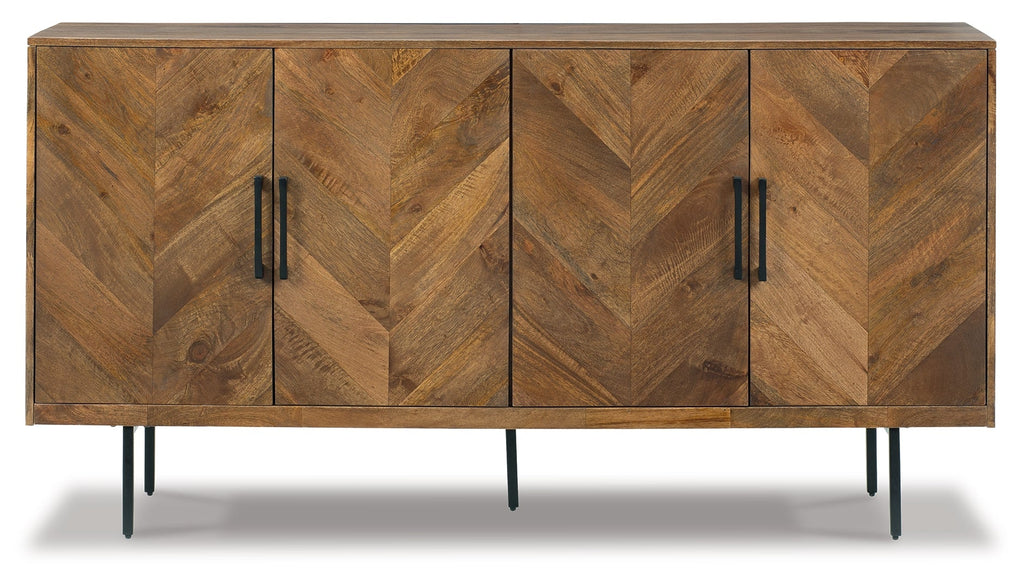 Storage options abound with this accent cabinet featuring 4 chevron pattern doors accented by long dark gray finished metal door pulls. Store dinnerware, cookbooks and many other options within the sideboard which features 2 fixed shelves. The light brown finish will complement virtually any room decor.