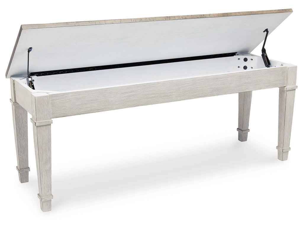 This bench invites you to strike a note for small space living. An inspired choice for coastal chic or modern farmhouse settings, this piano style bench with under seat storage sports a grayish white finish with rub through effect for timeworn appeal.