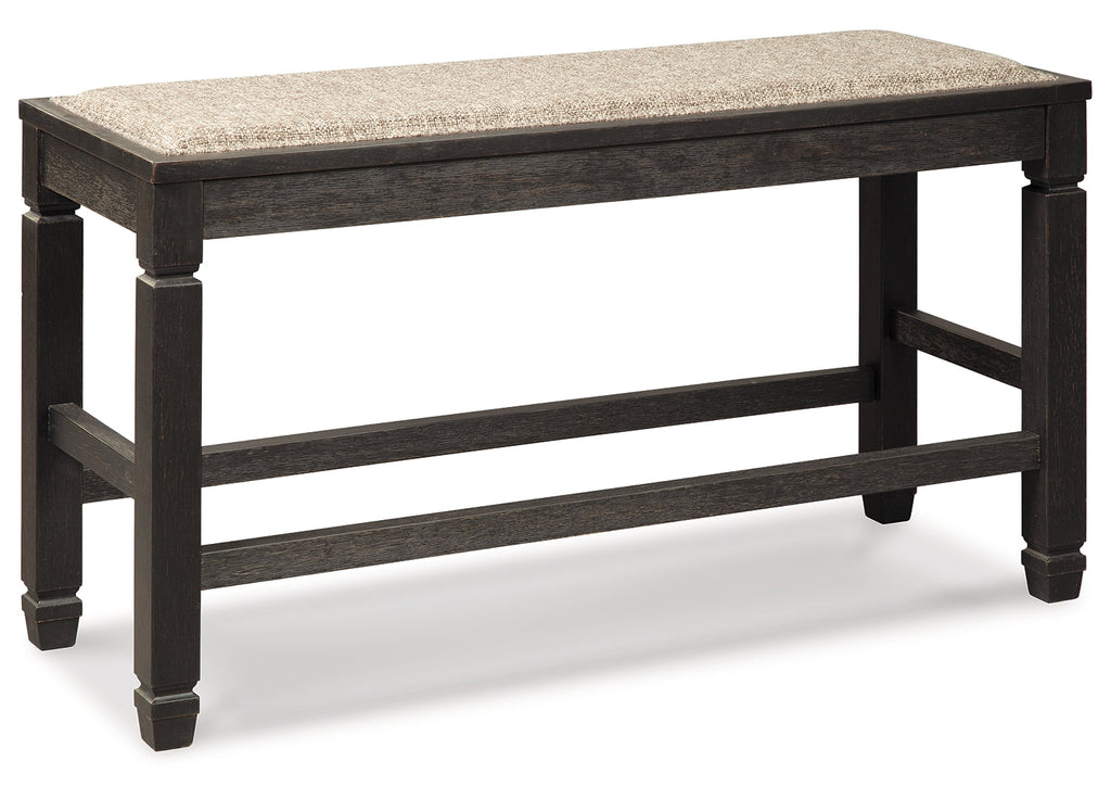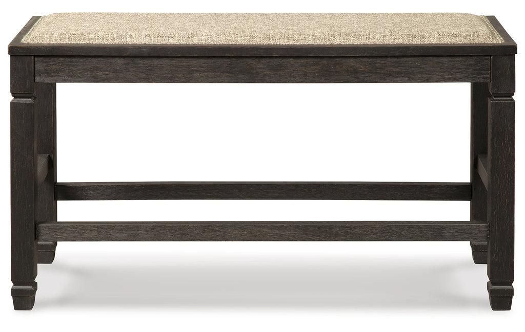 Invite your family into the heart of your home with this upholstered dining room bench. Tapered legs are a sturdy foundation, while the counter-height design raises the bar on fine dining. Textured black finish and heavy woven neutral upholstery accented with silvertone nailhead trim is trend-right urban farmhouse style without all the fuss.