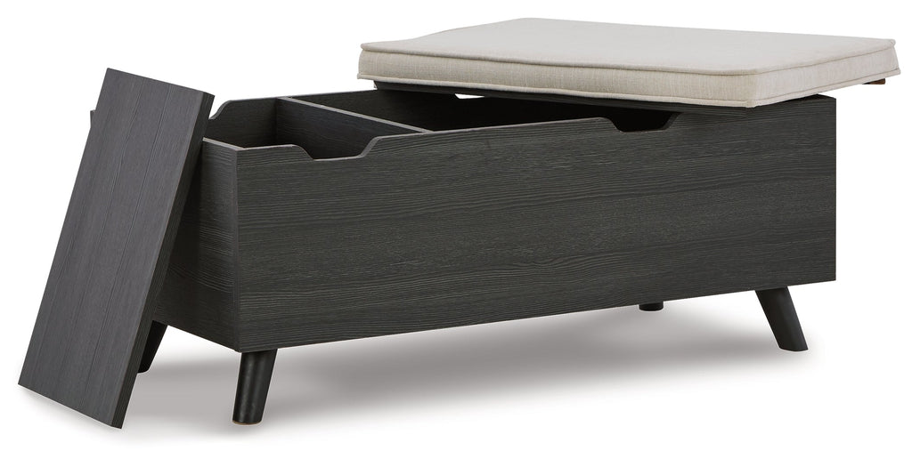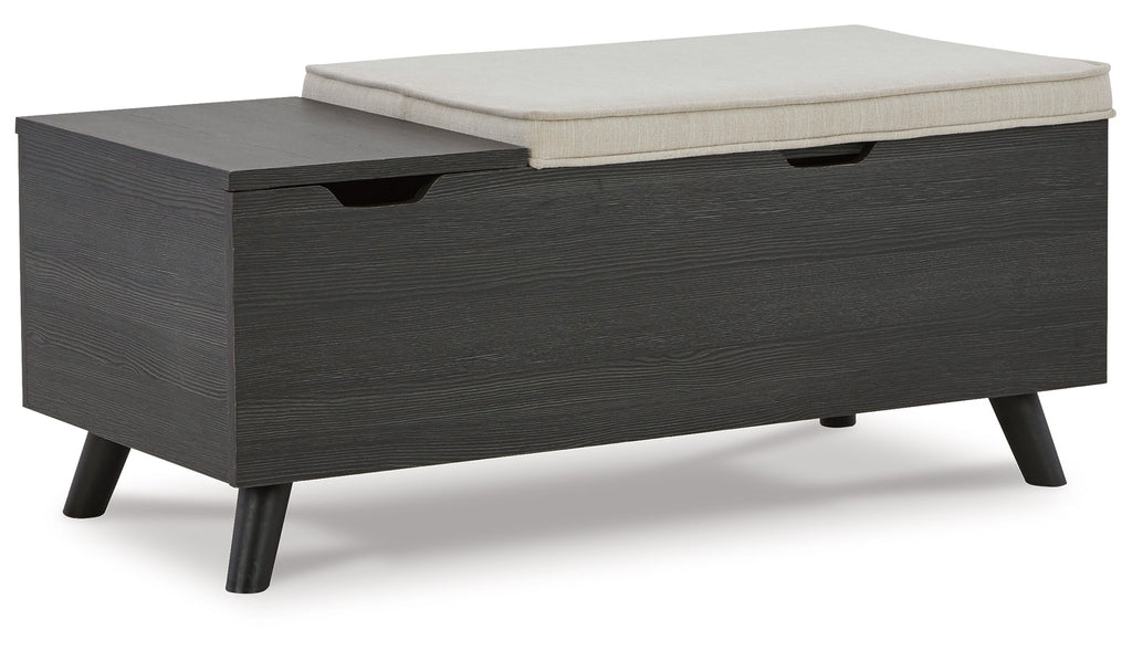 The clean profile of this small storage bench makes an entrance anywhere and everywhere you place it. Replicated blackened wood finish with a grayed textural grain and tapered wood legs lend a fresh flair. Adding form and function, both tops are removable to expose hidden storage underneath. A must-have piece for small spaces.