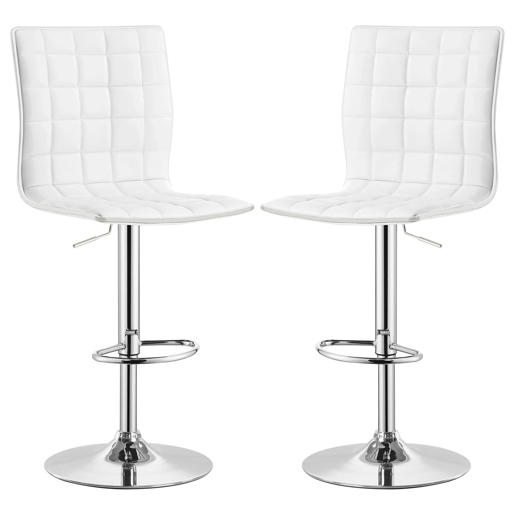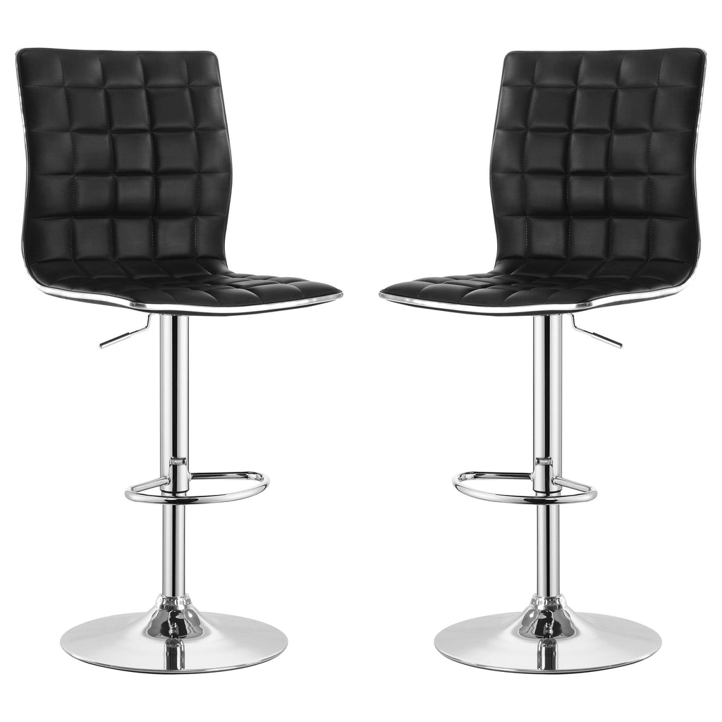 Intersecting vertical and horizontal stitching creates appealing waffle texture on this contemporary adjustable barstool. Easily rising and lowering to meet your special needs, this stool offers a modern silhouette with comfortable and supportive seating. Upholstered in black leather-look fabric, chrome accents add gleaming flair. A pedestal base with a round foot delivers a familiar but stylish profile. A built-in footrest encourages friends and family to linger over a great drink or delicious dessert.