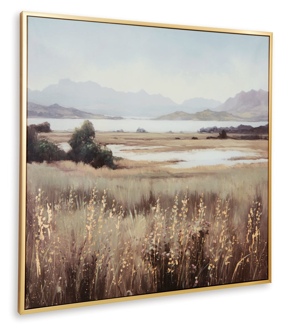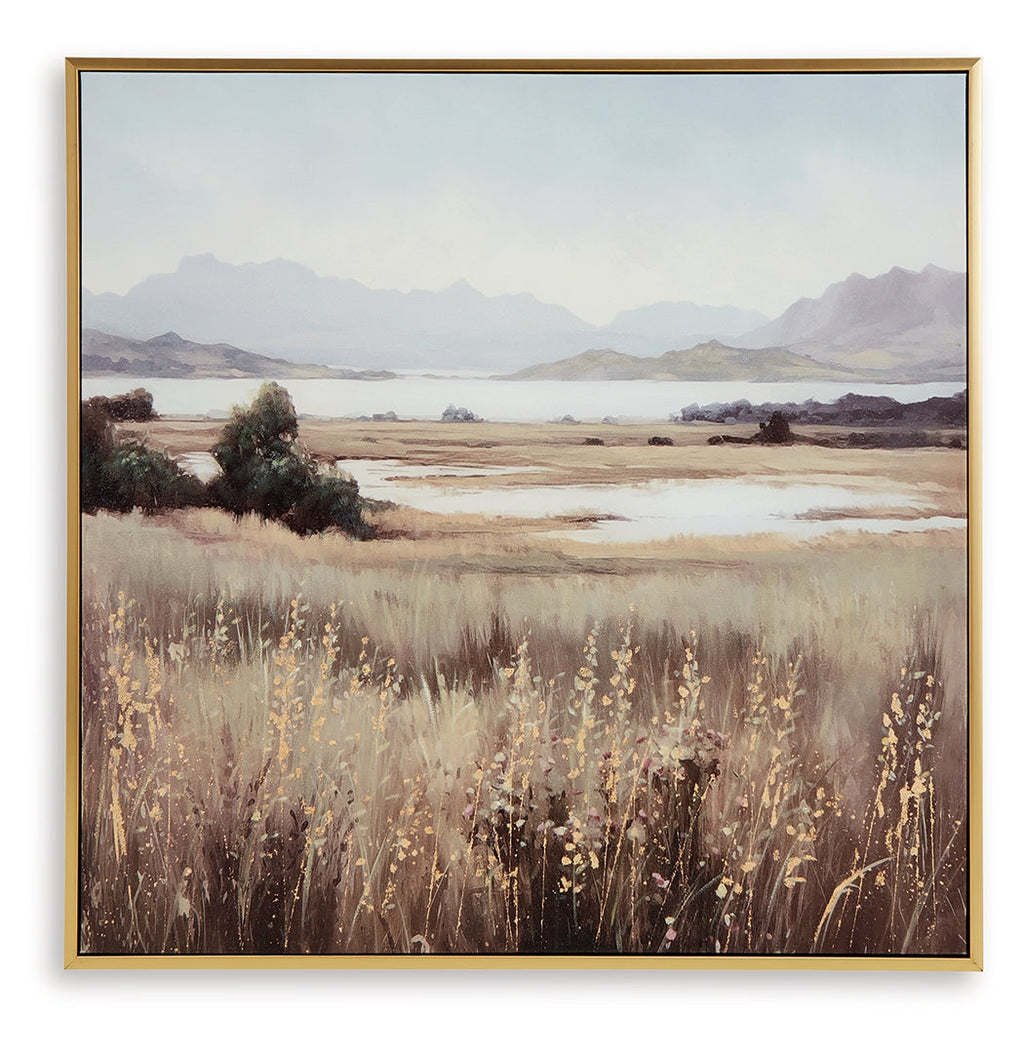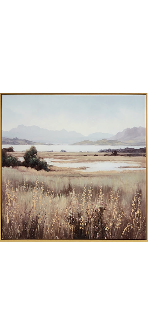 This wall art puts a peaceful spin on hanging decor. Its quiet landscape invites you to a lakeside field, with rolling mountains in the background that bring depth to the design. Hand-painted and gold leaf embellishments make each piece unique.