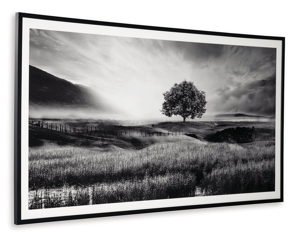 Filled with calming natural elements, this wall art has a refined look with a restful feel. It captures a landscape with rolling hills, drawing your eye to the tree standing tall in the center of the creation. Lighter tones in the clouds bring brightness to the black and white design, making for a striking addition to your modern decor.