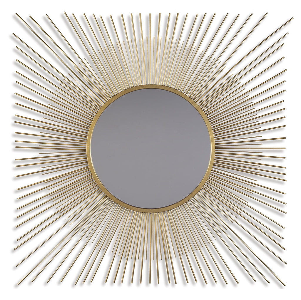 This accent mirror is a contemporary musing. Breathtaking sunburst design shines in goldtone metal. Beautifully large scale makes this piece the center of attention.