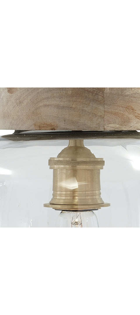The mixed materials of this pendant light are right in line with the times. A turned natural wood finial crowns the alluring half-dome glass shade.