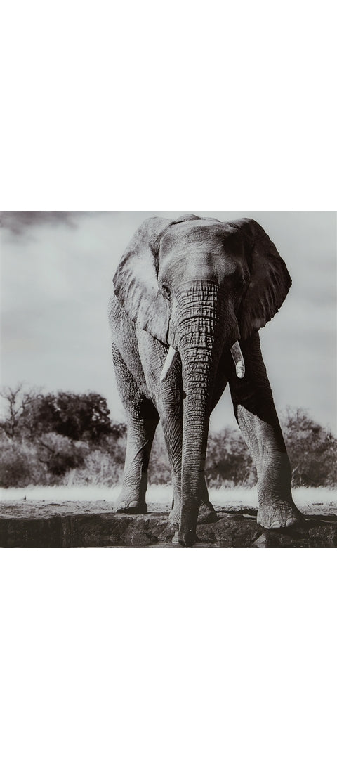 The elephant has long symbolized strength, intelligence and good luck. Celebrate this majestic creature and express your personality with this wall art. The black and white print on glass makes a bold and visually striking statement.