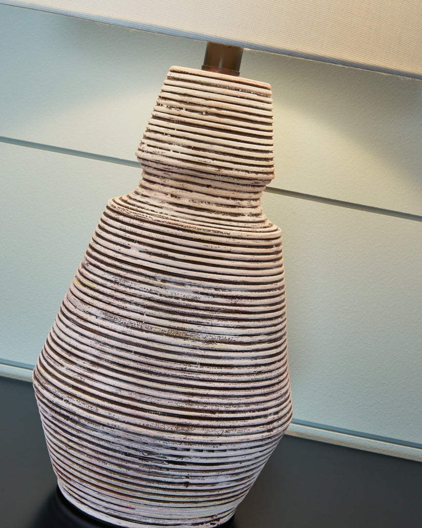 Add an impressive design element to your home with this table lamp. The distressed resin body in brick red and white is topped off with a crisp, fresh fabric shade. Low profile yet eye-catching, this lamp makes a gorgeous accent for contemporary and mid-century modern spaces.
