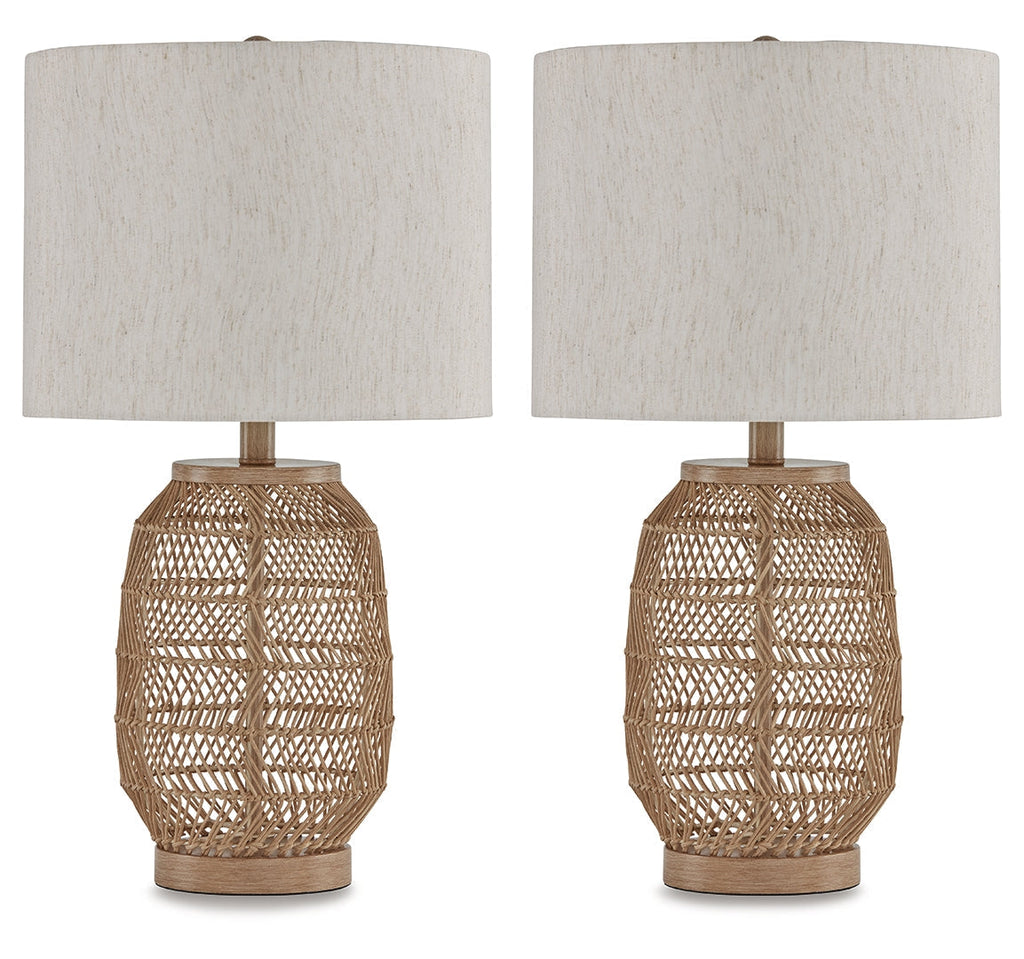 Embrace a perfect dose of beachy, modern boho-chic style with this table lamp set. Its organic look, with a base of natural rattan arranged on a metal frame, is perfect for a variety of interiors. Up top is a crisp, white fabric drum shade. At the bottom, a round beige pedestal offsets the rattan and shade nicely.