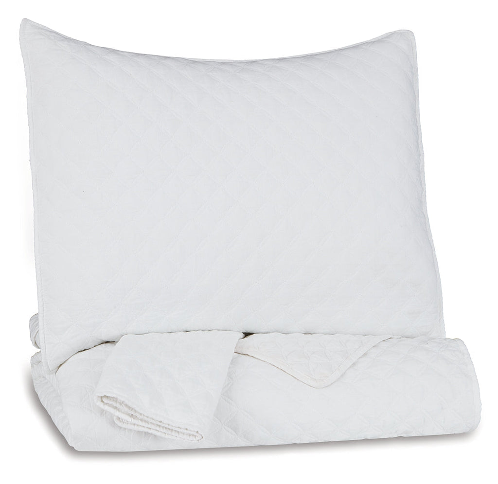 Relax and recharge with this coverlet set. Its quilted diamond design in white stonewash is a look that complements just about any decor style. With this coverlet’s casual-cool flair and soft feel, it’s sure to make jumping into bed your favorite part of each night.
