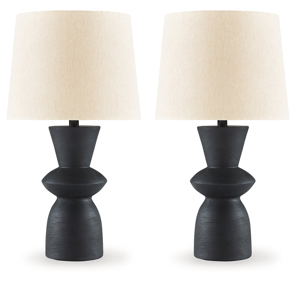 Turn on the brilliance and modern flair of this table lamp set. The angular silhouette and intriguing base in distressed black are the definition of bold style. These lamps pair wonderfully with contemporary furniture.