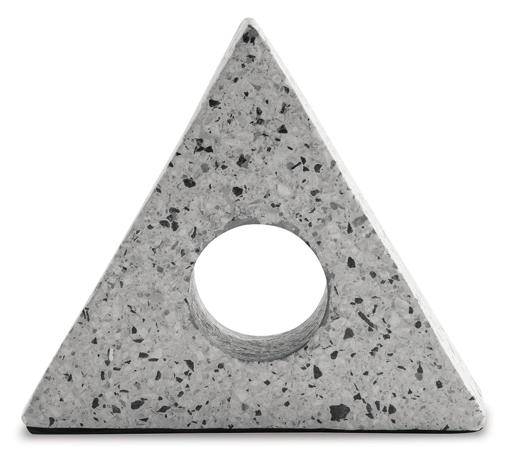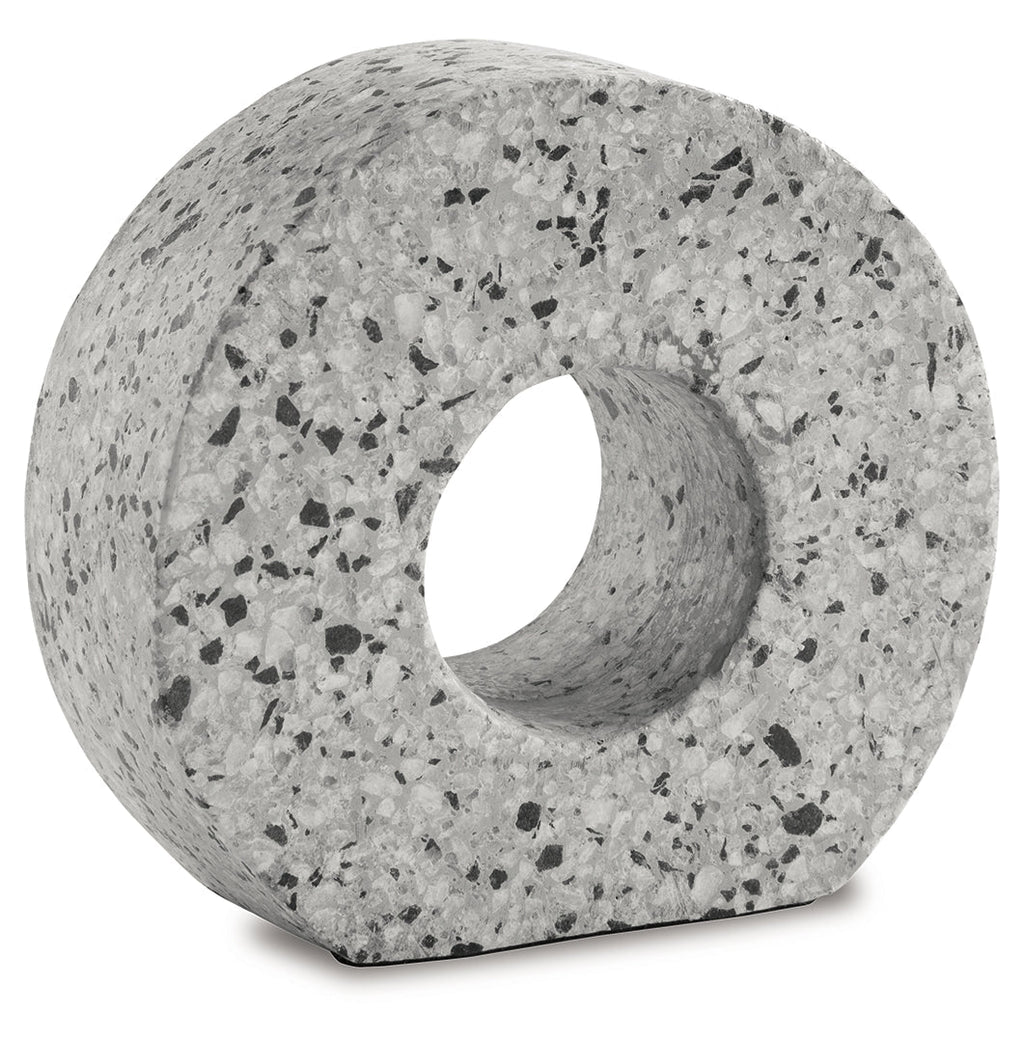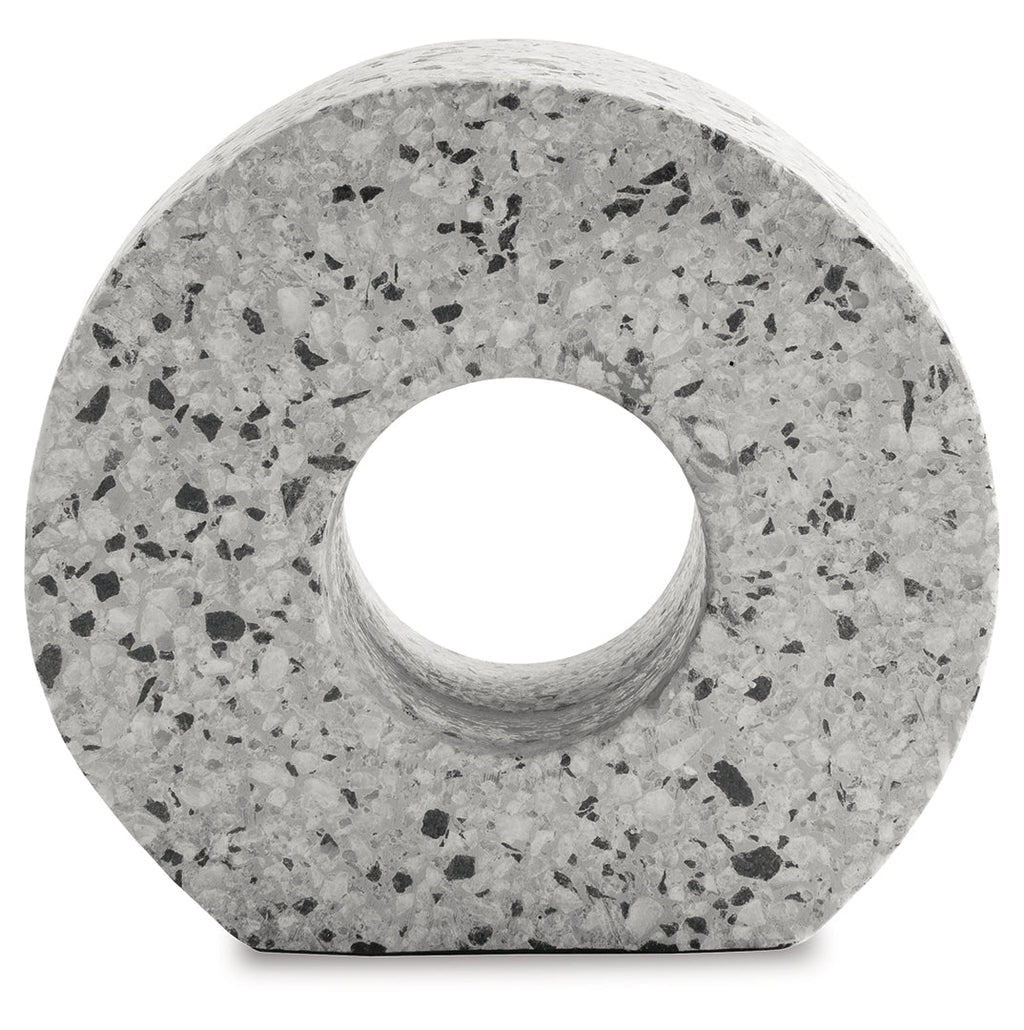 Bring a shelf, table or desk full circle with a cool touch of contemporary art. With its black and white marble flecks, this cement sculpture is striking from every angle.