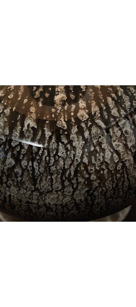 This accent lamp distinguishes itself in any setting. Its dark glass body is round and distinct, providing a mood of rustic romance.