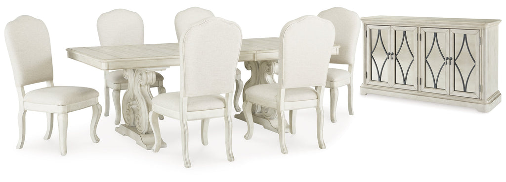 Serve up a sophisticated dining experience with this package. Its antiqued white painted finish is all about easy elegance. Shapely silhouettes enhance the set's romantic character, further indulging your love of luxury.