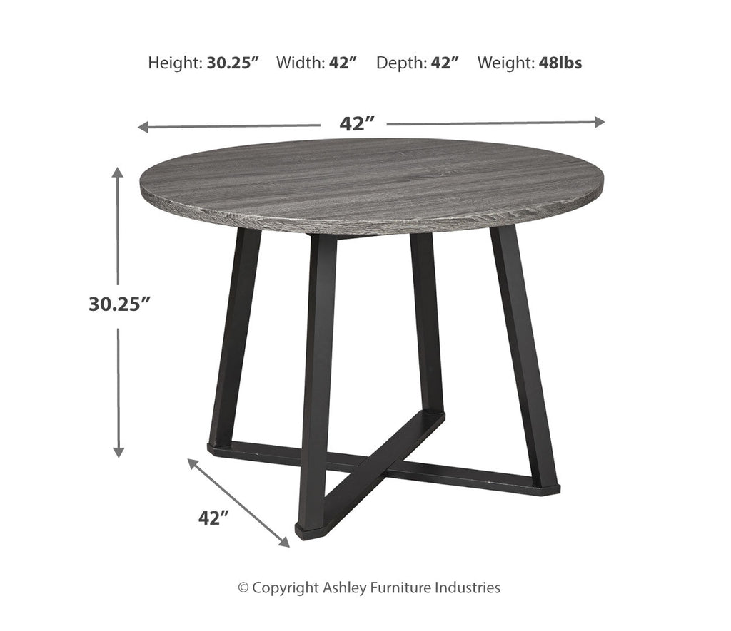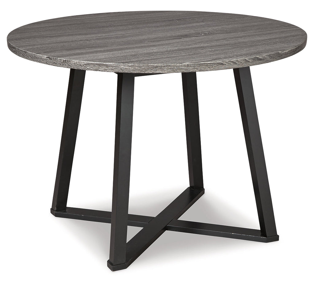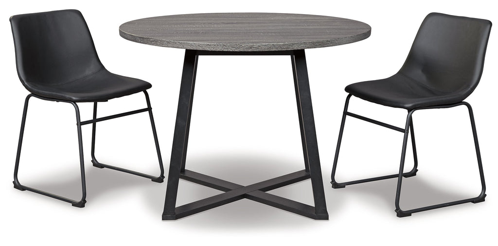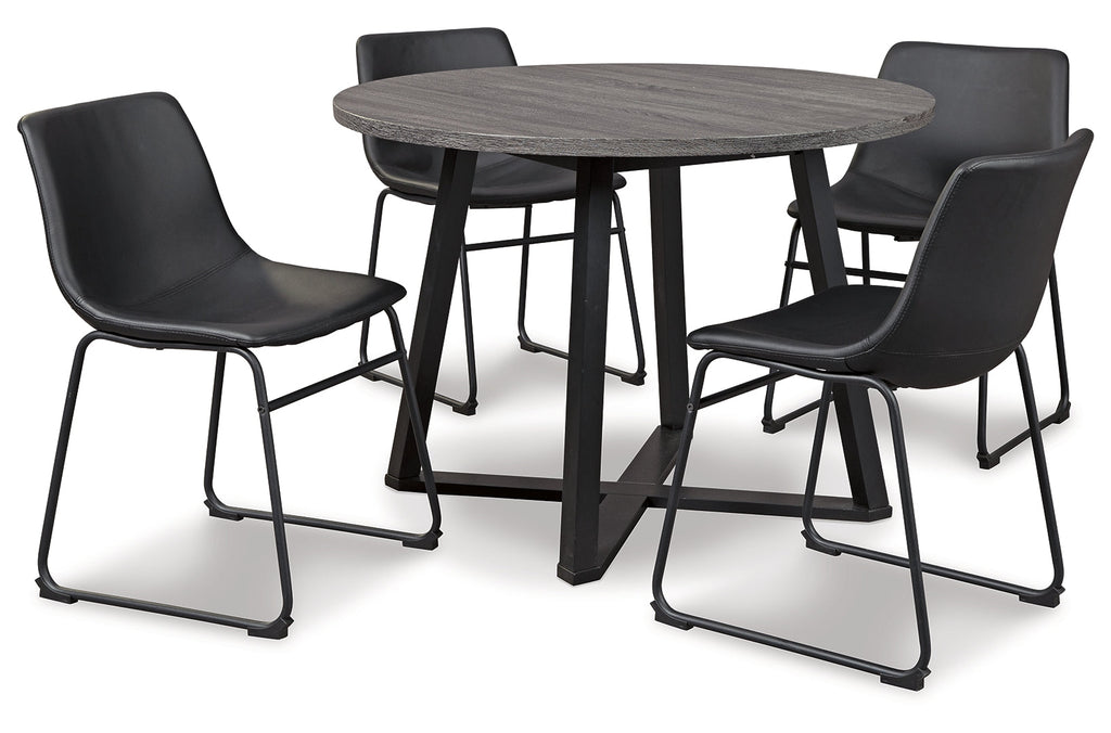 With its distinctive features, this striking dining set serves up a fresh twist on mid-century inspired style. Faux leather upholstery on the chair has a charmingly vintage tone. The table’s mixed material and two-tone aesthetic are beautifully in balance. Sporting a dramatic charcoal gray hue, the top is crafted of durable melamine, allowing it to weather years of family thrills and spills. What a timeless look for eat-in kitchens and casually cool dining rooms.