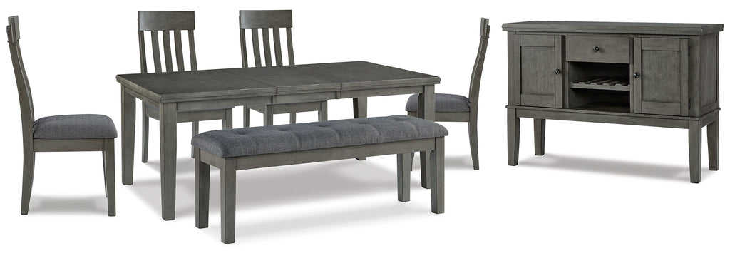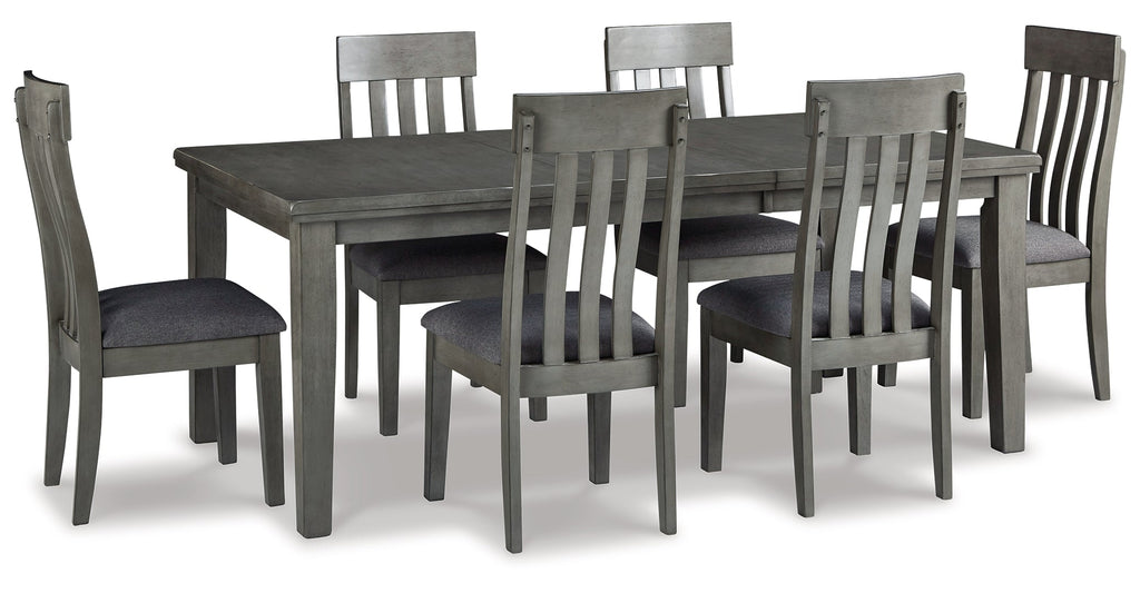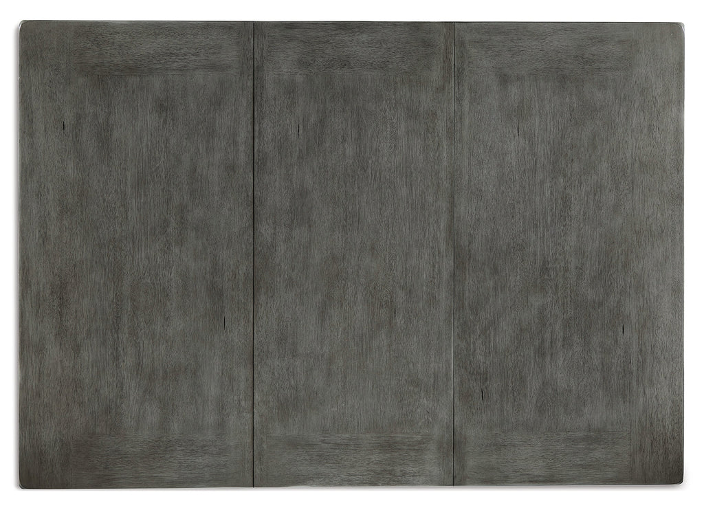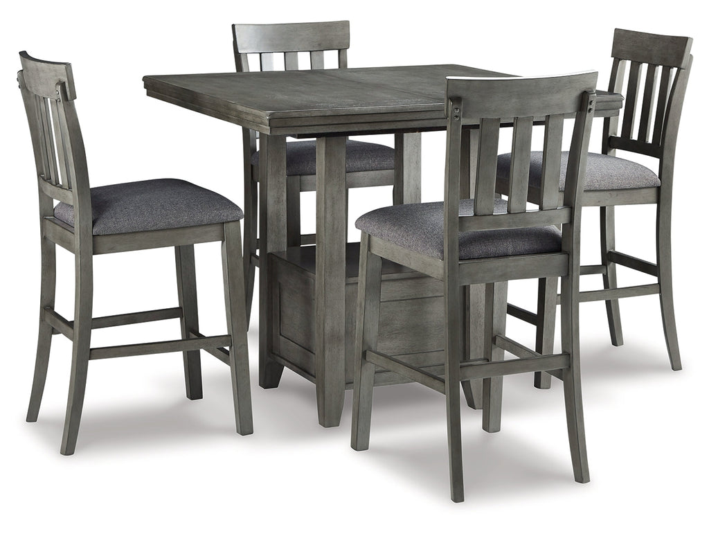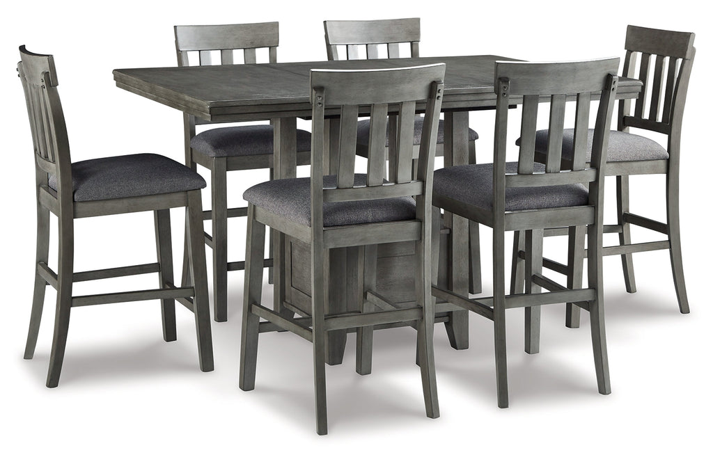 Cool and on-trend. This counter-height dining package sports an antiqued gray finish and gray textural fabric for a contemporary-yet-casual feel. The table features a storage base and removable leaf for extra seating room, making it a breeze to clear off clutter and expand your table space. Comfortably cushioned, the barstool features a padded seat, while its contoured comb-back design adds a dash of geometric flair. With this set, it's easy to dine in style.