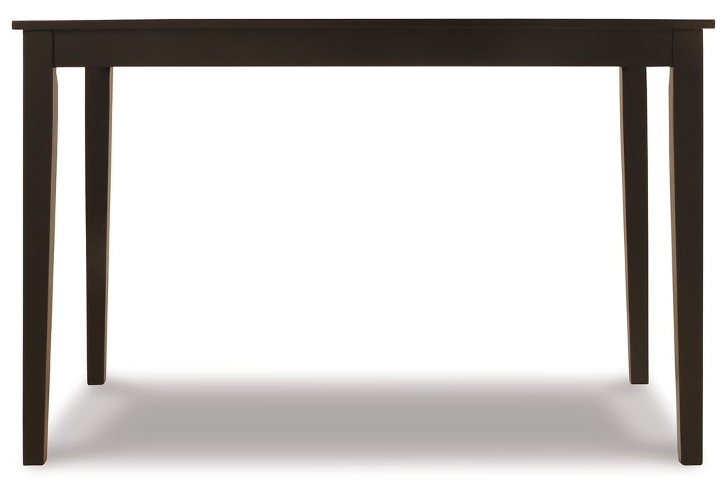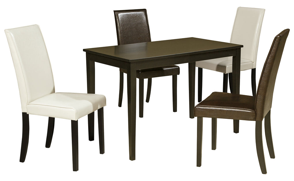 This dining table set might be big on style, but its petite scale is ideally suited for small spaces. Dark finish and minimalist design make this dining table set the epitome of contemporary decor. Four comfortably cushioned high-back chairs covered in an ivory-tone faux leather make it easy to linger at the table.