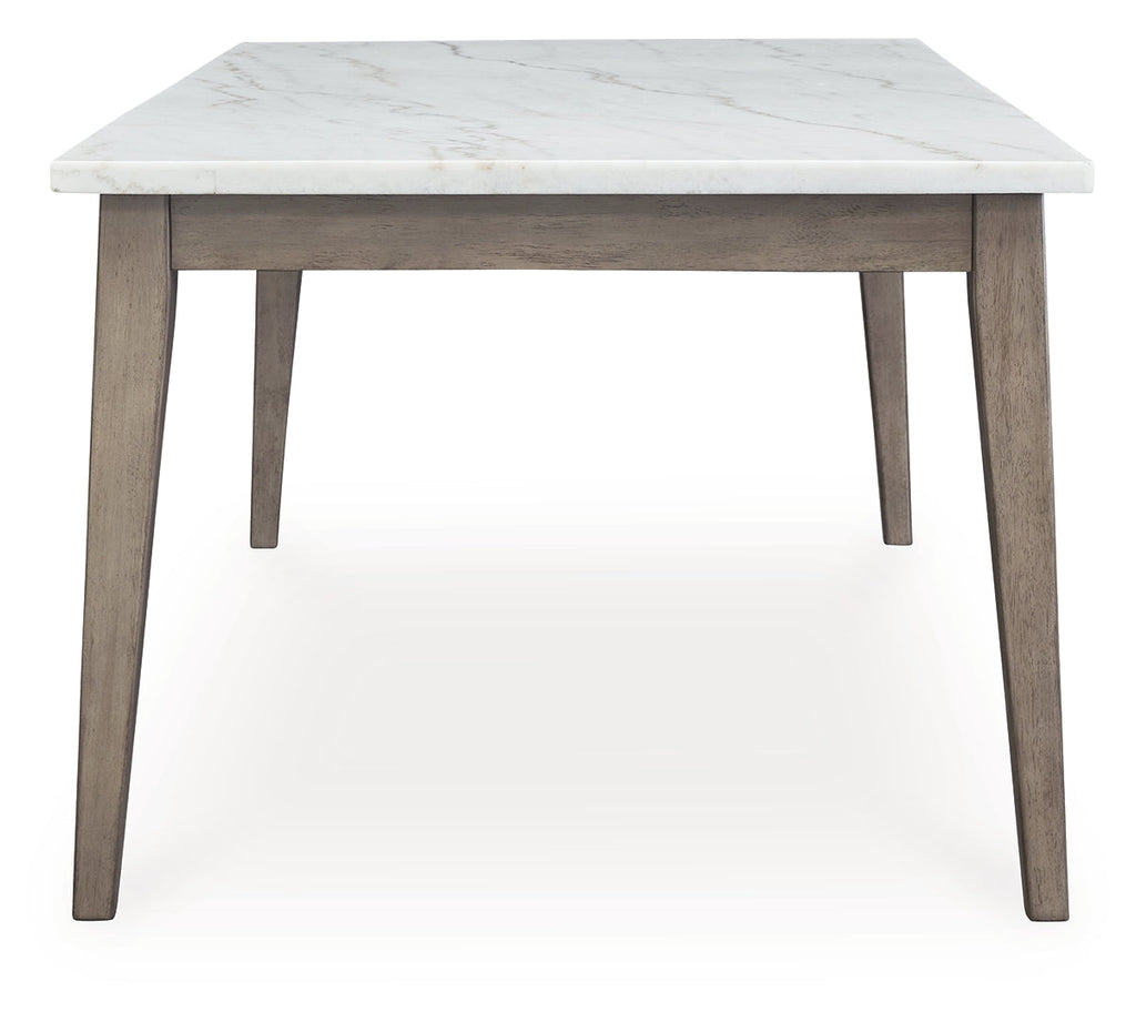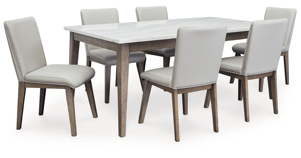 Easygoing appeal meets graceful refinement with this dining ensemble. An on-trend grayish brown finish, white marble tabletop and modern chairs upholstered in taupe faux leather are sure to add panache to your dining experience. Whether you're entertaining or enjoying your own nest, this set exudes elegance and sophistication.