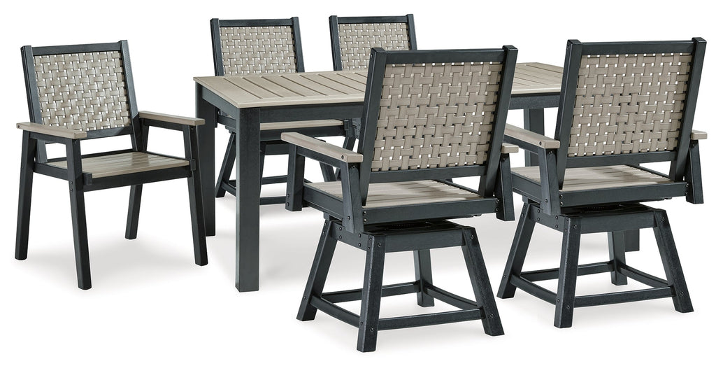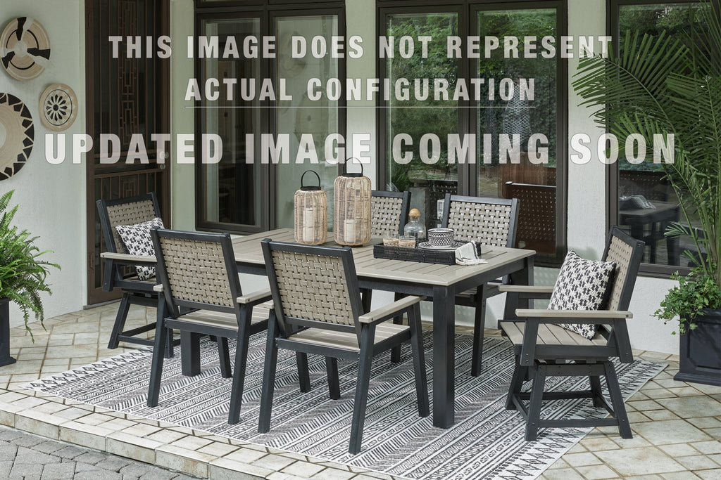 On-trend stylings take to the outdoors with this dining package. Its two-tone look in driftwood and black has a laid-back luxe appeal. High design meets durability with this outdoor set’s weather-resistant HDPE construction—a stunning display of form and function.