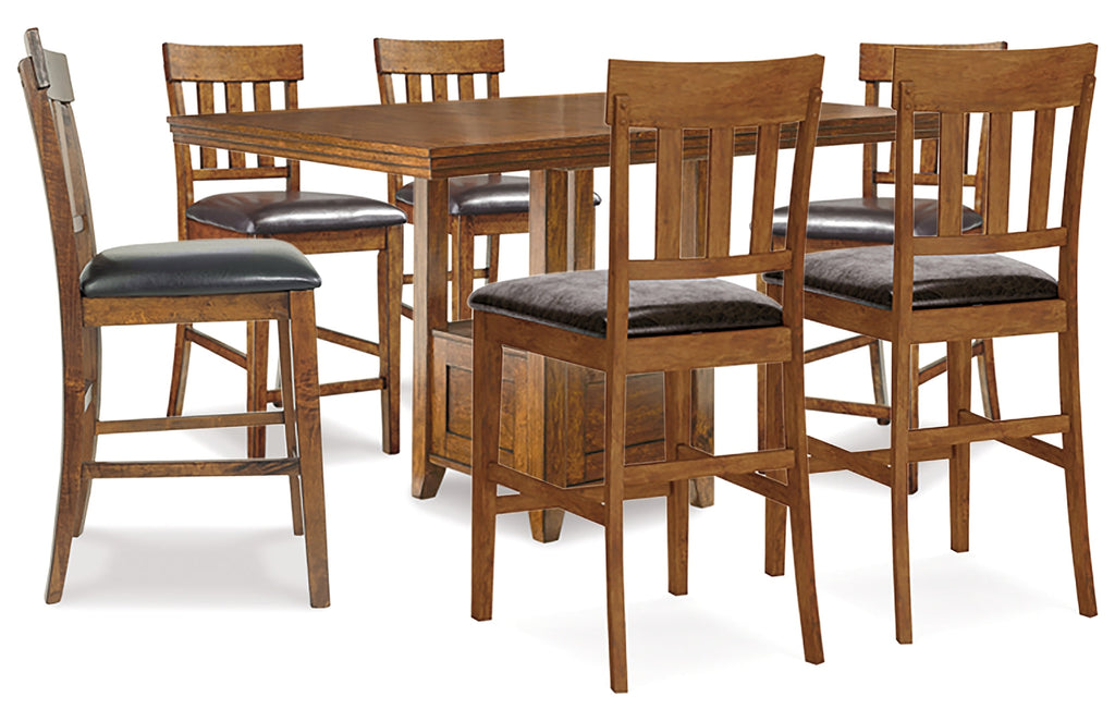 Have an appetite for clean-lined design, but with warmth and rustic character? Satisfaction is served with this dining room set. Its gently distressed, burnished finish and shelf-style pedestal incorporate depth and character. While the separate extension leaf easily expands your seating options. Bar stools with cushioned faux leather upholstery are a wonderful show of good taste.