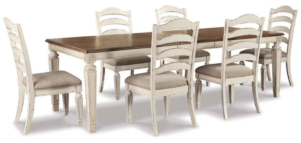 Bon appétit. This 7-piece dining room set has all the right ingredients for a French country-inspired feast for the eyes. Drop-in leaf allows you to transform the intimate square dining table into a gracious extension table that comfortably seats eight. Antiqued two-tone aesthetic pairs chipped white with a distressed wood finished top for a double serving of charm. With its rounded ladderback styling and plushly cushioned seat, this dining room chair is sure to entice you to linger a little longer.