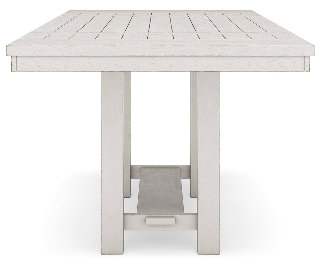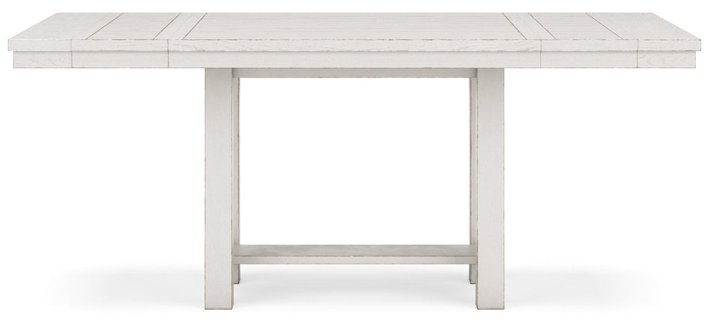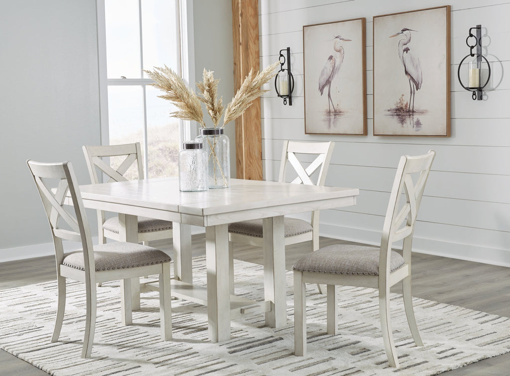 This dining package is sure to impress come mealtime. With its antiqued white finish, light gray upholstery and a planked effect tabletop that extends for additional seating, farmhouse-style seating has never been so fashionable. All that’s missing is you and your family.