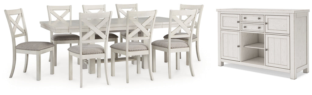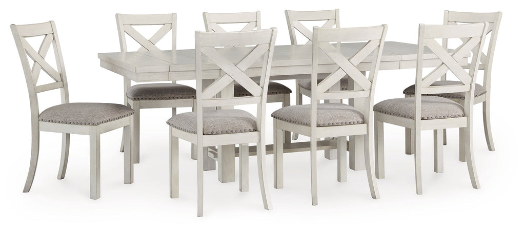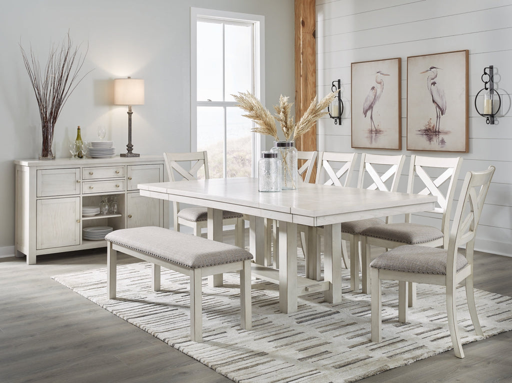 This dining package is sure to impress come mealtime. With its antiqued white finish and a planked effect tabletop, farmhouse-style dining has never been so fashionable. All that’s missing is you and your family.