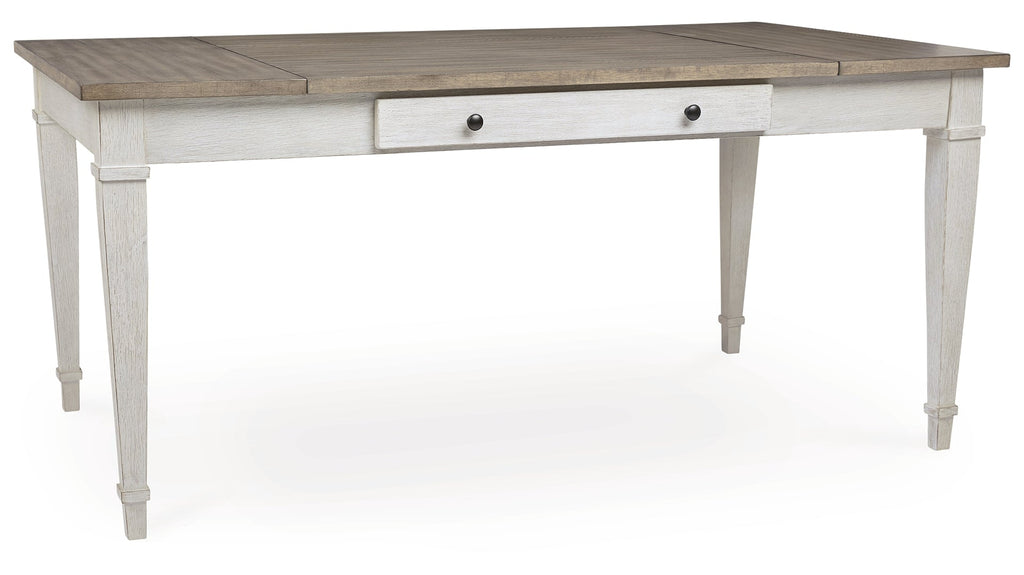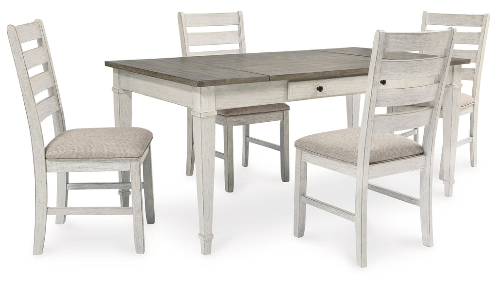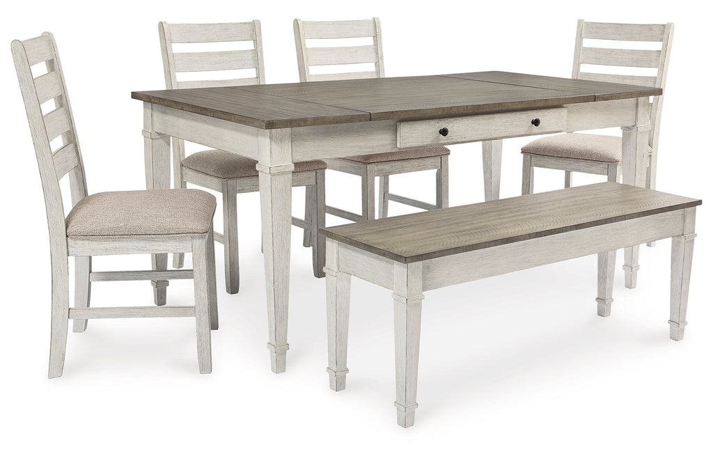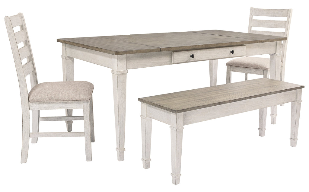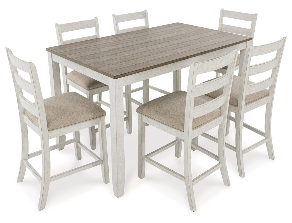 Raise the bar on small space living with the Skempton 3-piece counter-height dining set. An inspired choice for coastal chic or modern farmhouse settings, this strikingly simple table marries a brown tone plank-effect top with a rubbed-through grayish white base for timeworn appeal. The table’s side shelves and 8-bottle wine rack cleverly balance form and function while the comfortably cushioned bar stools serve up high style.