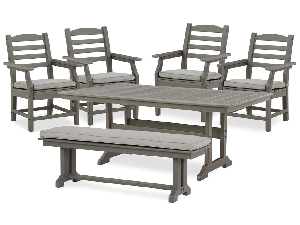 It’s the dawn of a new day for gray. Embrace the style trend with this outdoor dining set. Each piece is crafted of HDPE material, combining the exceptional durability and weather resistance you need with the “wood look” you love. The rectangular table and comfortably cushioned chairs take alfresco living to a whole new level. A slatted table top infuses a plank-style, farmhouse-inspired touch and naturally sheds rainwater. Rest assured, the thick seat and back cushions on the chair are wrapped in Nuvella® high-performance fabric that’s fade-resistant, stain-resistant and a breeze to clean.