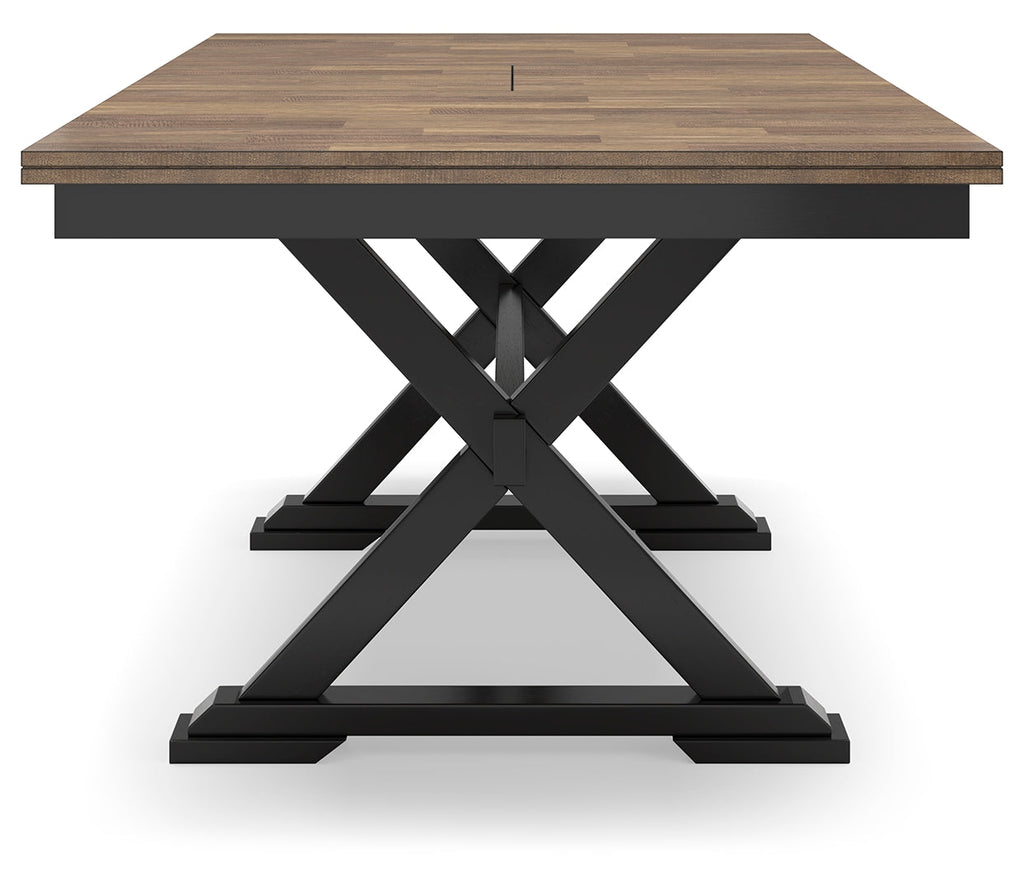 - Tabletop with butcher block veneer pattern in deep brown wood tone finish