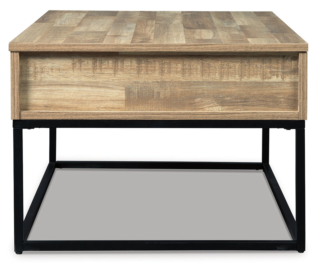 This cool coffee table offers a fresh take on urban style with a casual lift top design and replicated butcher block finish. The metal base elevates the table and provides open space to add a lightness to your room.