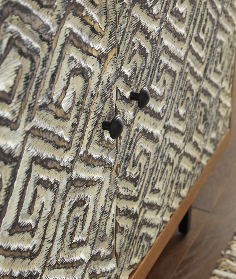 If you’re looking for a cool, clean-lined accent piece loaded with character, then you’ll surely want to carve out some space for this accent cabinet. Fabulous flush-mount doors wow with their carved Greek key design for added dimension and tonal contrast. Three interior shelves accommodate your storage needs.