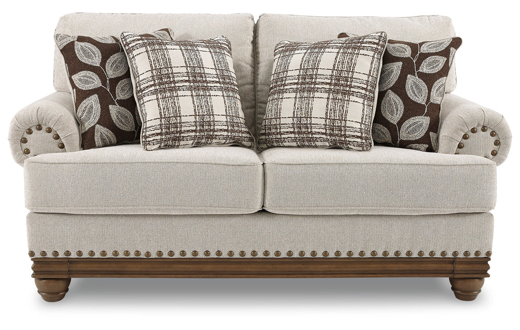 True classic character comes to life in this sofa and loveseat set. Setback pleated roll arms and warm brown exposed frame with bun feet are richly traditional. Covered in a plush wheat-tone upholstery with herringbone weave, this living room set includes reversible seat cushions for comfort and durability. Bronze-tone jumbo nailhead trim and plaid and botanical patterned pillows in earthy brown perfect the aesthetic.