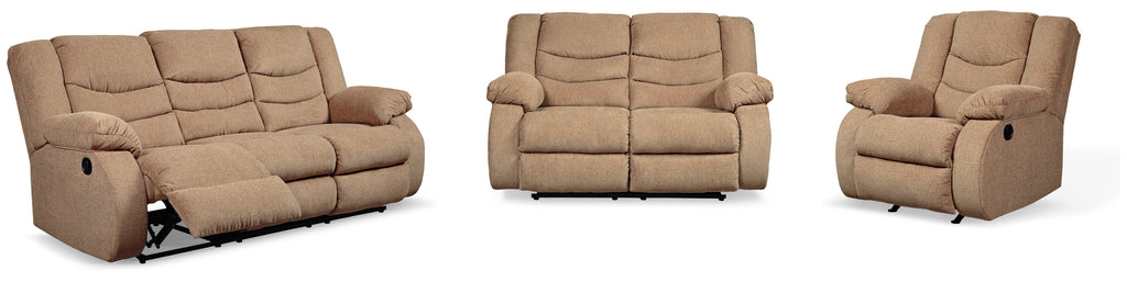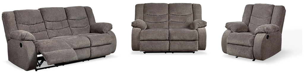 This reclining sofa and loveseat package puts the win in winning. The waterfall back design and doubly plump pillow top arms team up with soft chenille fabric to go for the goal. Ample seating room makes the comfort possibilities endless. Sit back and relax. You won’t go wrong with this reclining seating set.