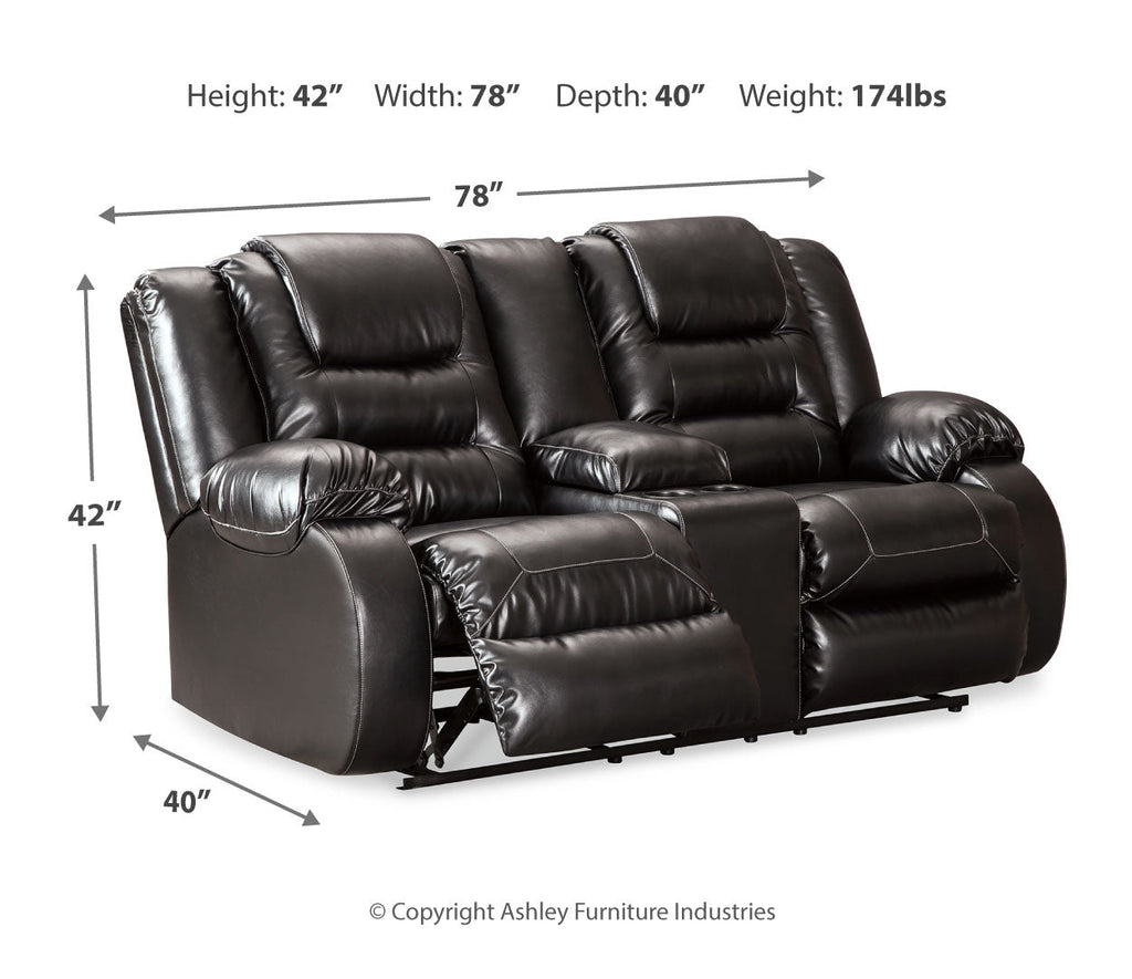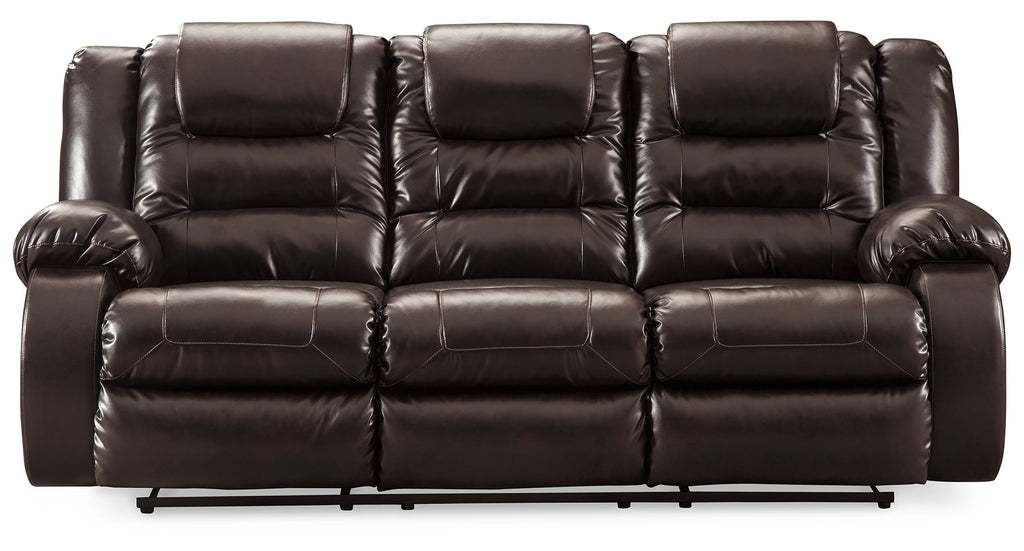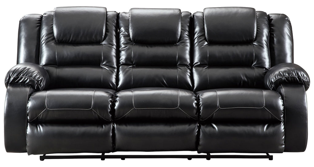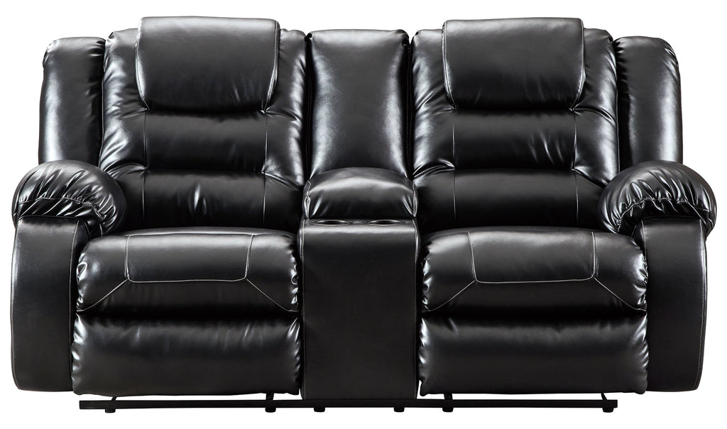 When it comes to comfort, style and value, this faux leather reclining sofa and reclining loveseat in black rocks. Tailored for feel-good flair, its fashion-forward bustle back design is enhanced with sculpted padding on the headrest for cradling support. Channel cushioning along the sides flows into thick, wrapped pillowtop armrests that are truly over the top. And while it might look like you broke the bank, a sumptuously soft leather-like fabric keeps indulgence well within budget.